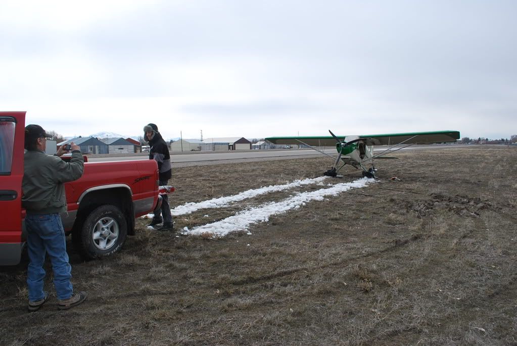 After concluding my business, I tried a takeoff, didn't even budge, so with a borrowed pickup and a few shovels we transferred some snow from some nearby drifts, and ended up getting sick of shoveling after we had 35' of snowpack. One unforseen complication was the truck left some tracks in the soft dirt, we smoothed them out a bit and called it good. Full power (duhh) and once off the snow I had enough speed to keep accellerating, and the takeoff was uneventfull. A good experience all in all, good for future reference. I was close to home and had plenty of backup resources if needed, and I was able to save having to drive the 40 mile one way trip versus the 28 mile straight shot, plus I got to make a dozen or so landings on the way home. All it took was about 10 minutes of shoveling snow :shock: ImageImage