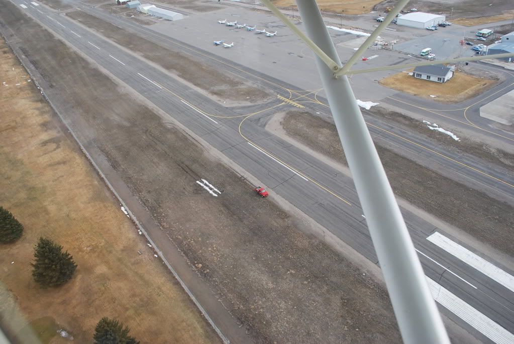 I wasn't worried, being right there at the Milloway Skunkworks, I mean where better to have problems in a S-7?! He has enough parts to take care of any problem! I think they were more concerned then I, it probably looked worse then it felt! Sort of like a dragging brake was about all, both landing and the takeoff. Now, trying it with one ski down and one up would have been really going into the unknown, this just didn't feel bad at all, remember I didn't have to land, just wanted to save the drive, and when the initial touchdown felt OK, I just continued.