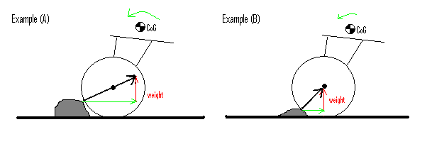 The green arrow is the force (resistance) created when the weight of the plane tried to roll over the obstacle. The higher up the wheel the obstacle hits, the larger the black force needs to become to get over it while supporting the same weight (red), and the larger the green arrow becomes (black arrow always acts through the centreline of the axle). This effect can be lessened by the tire changing shape (deforming around the obstacle) - that's why lower pressure helps.. There will come a point where the overturning moment (green arrow about the CoG) that gets created is large enough to overcome the weight of the tail (including control forces) and flip the plane onto it's nose. You can see, the location of the CoG effects what size this critical force is, and also the design (dimensions) of the aircraft play a part. The size of the tire is just one factor in the equation.