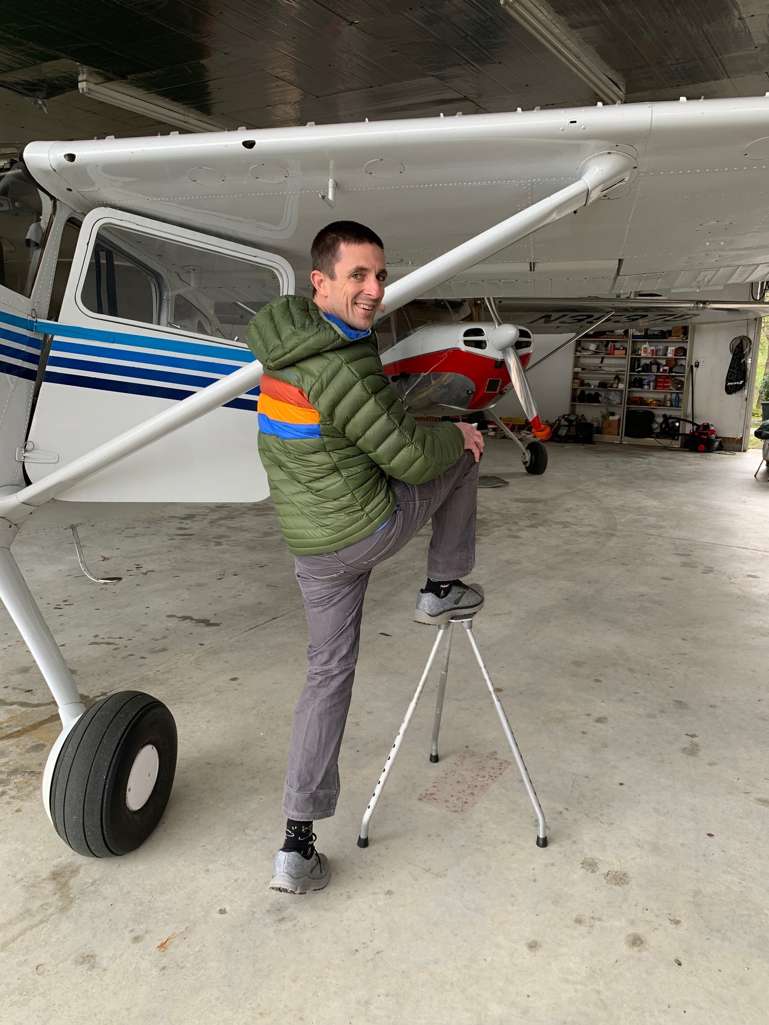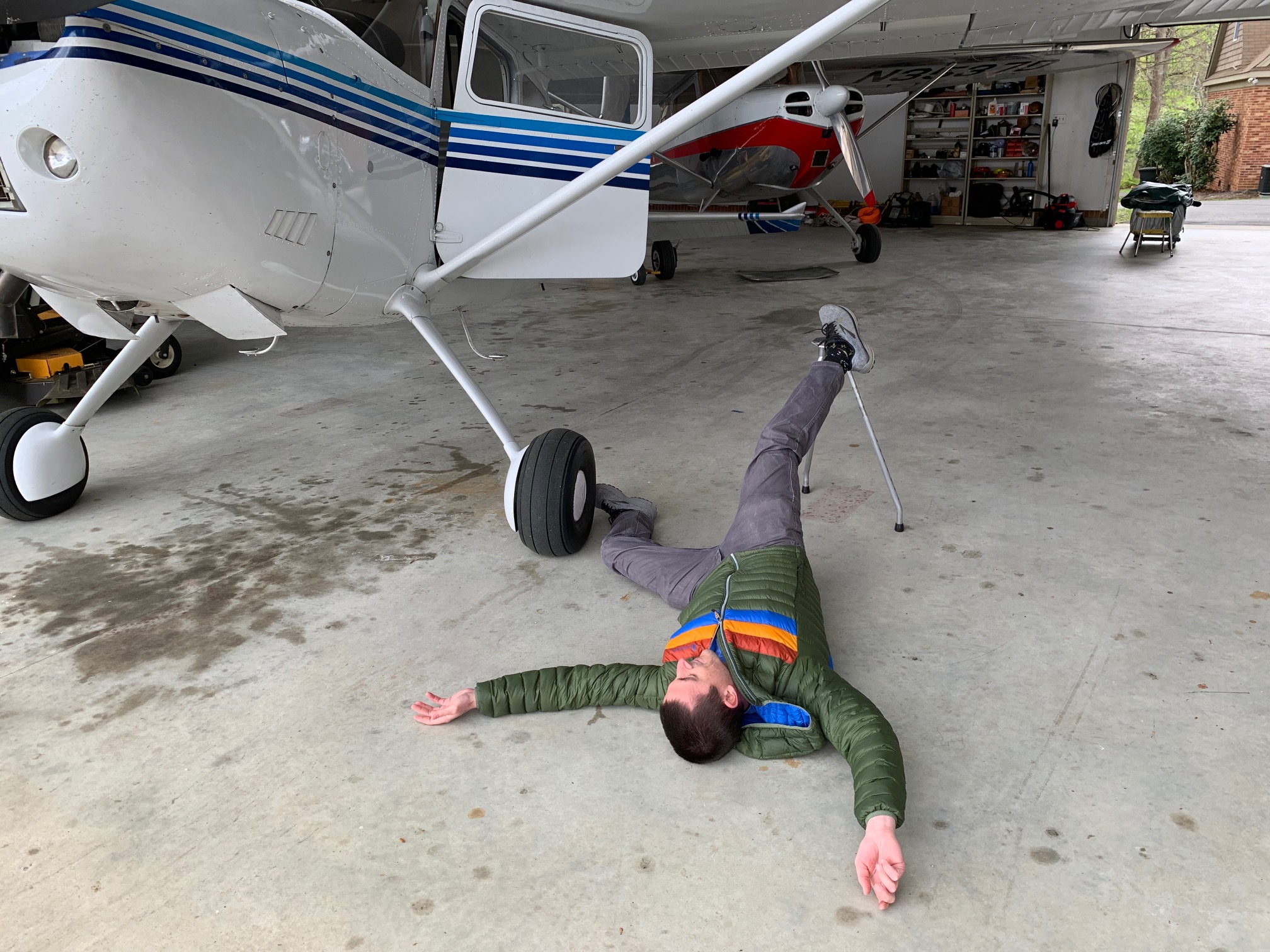 Looks kinda 'iffy' if used on a grass strip. Or sloping ground. Say, is that cement hangar floor got a little slope to it?