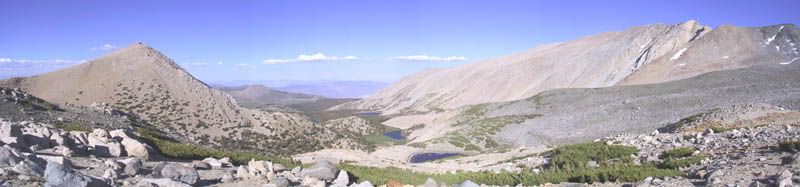 Looking east from the glacial moraine below Thunder & Lightning Lake towards Baker Lake, Twin Lakes et al. Coyote Flats is behind the mountain on the left side of the photo.