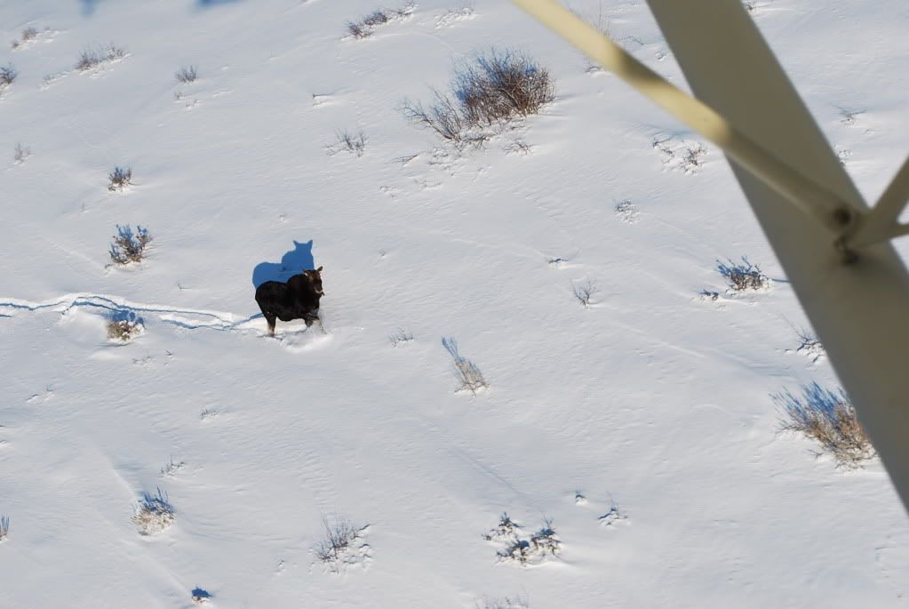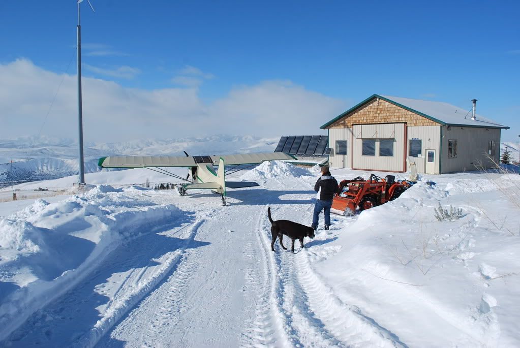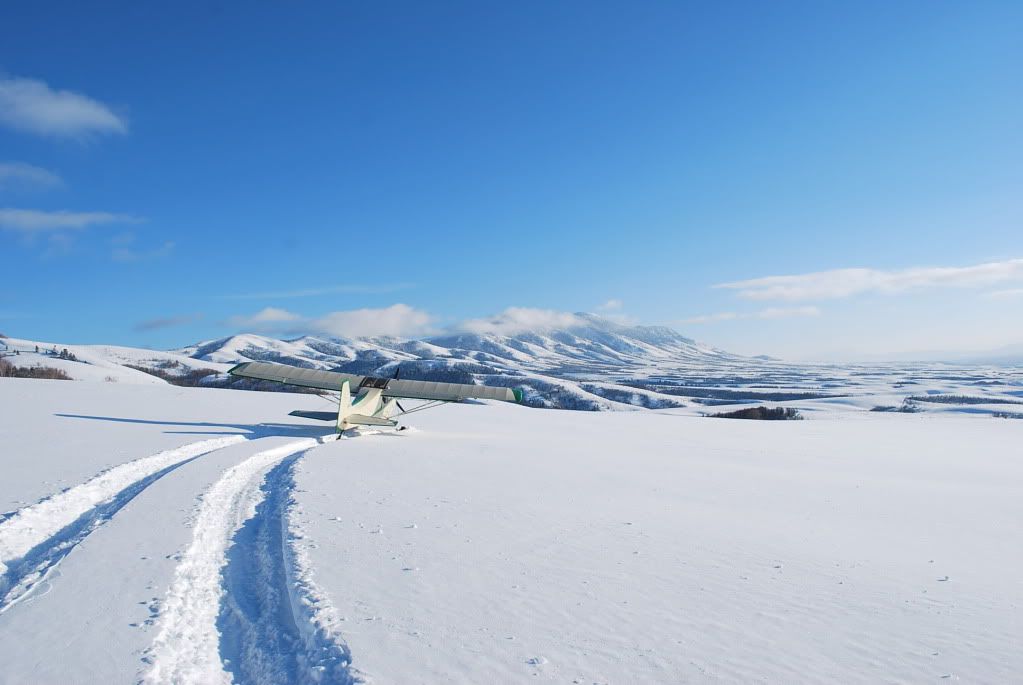 OK, now I'm in, skis are down, and Shannon is now the only thing keeping the plane from sliding forward as I restart, she has the rope in one hand and her dog in the other... and as agreed 10 seconds after startup I go to full throttle and she releases the rope and away I go, lifting off in about 140' of untracked snow. It was 7 degrees. Now I'm trailing 50' of 1/2" rope behind me, I just need to remember that when I get to Blackfoot.