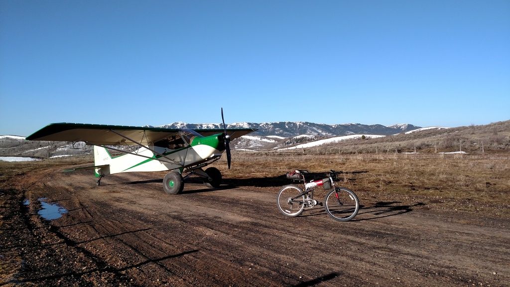 It was a round trip of 12 miles according to the bike odometer, and I used, compensating for the fact that I started with a battery that was only charged 80%, a bit more then half of it's capacity. Slowing down even a little will greatly increase this range, as will slowing down to normal bike speeds. Slowing down and pedaling a bit will easily double or triple it. Being in a big hurry, it was nice the folding process went as usual, quick and easy. But damn, I could never had pedaled this distance in the short time it took, my little airplane has just got a bunch more practical. Having a way to get around quickly and easily once on the ground is the bugaboo of most of us pilots and while it only has 2 wheels it gets the job done amazingly well. I can't wait for my first xc this summer where I'm cruising along looking at the sectional and planning a fuel/food/whatever stop, based on how close to town a strip is. Now my choices are going to be vastly increased. I'm also looking forward to some fairly serious trail riding, I just ordered a different gearing setup that will give me the same already adequate top speed, but a bit more of a stump puller/crawler low low range. These little electric motors love the higher RPM's, it keeps the heat down, heat kills them.