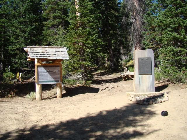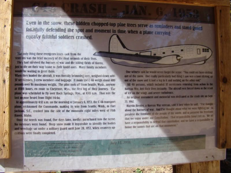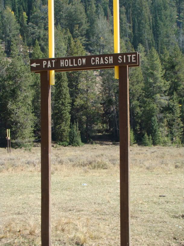 I asked around the town of Fish Haven if anyone could direct me to the site and no one had any idea what I was talking about. Long story short, I found a Forest Service map that showed a "point of interest" that matched a description I had seen on the internet. So a few of us headed up Fish Haven Canyon Rd. in search of the crash site, hoping to find something pointing us there. As it turns out, there was a Forest Service sign pointing us right to the crash site. We drove to within 50 yards of the Memorial that was erected by another Scout Troop, I believe.