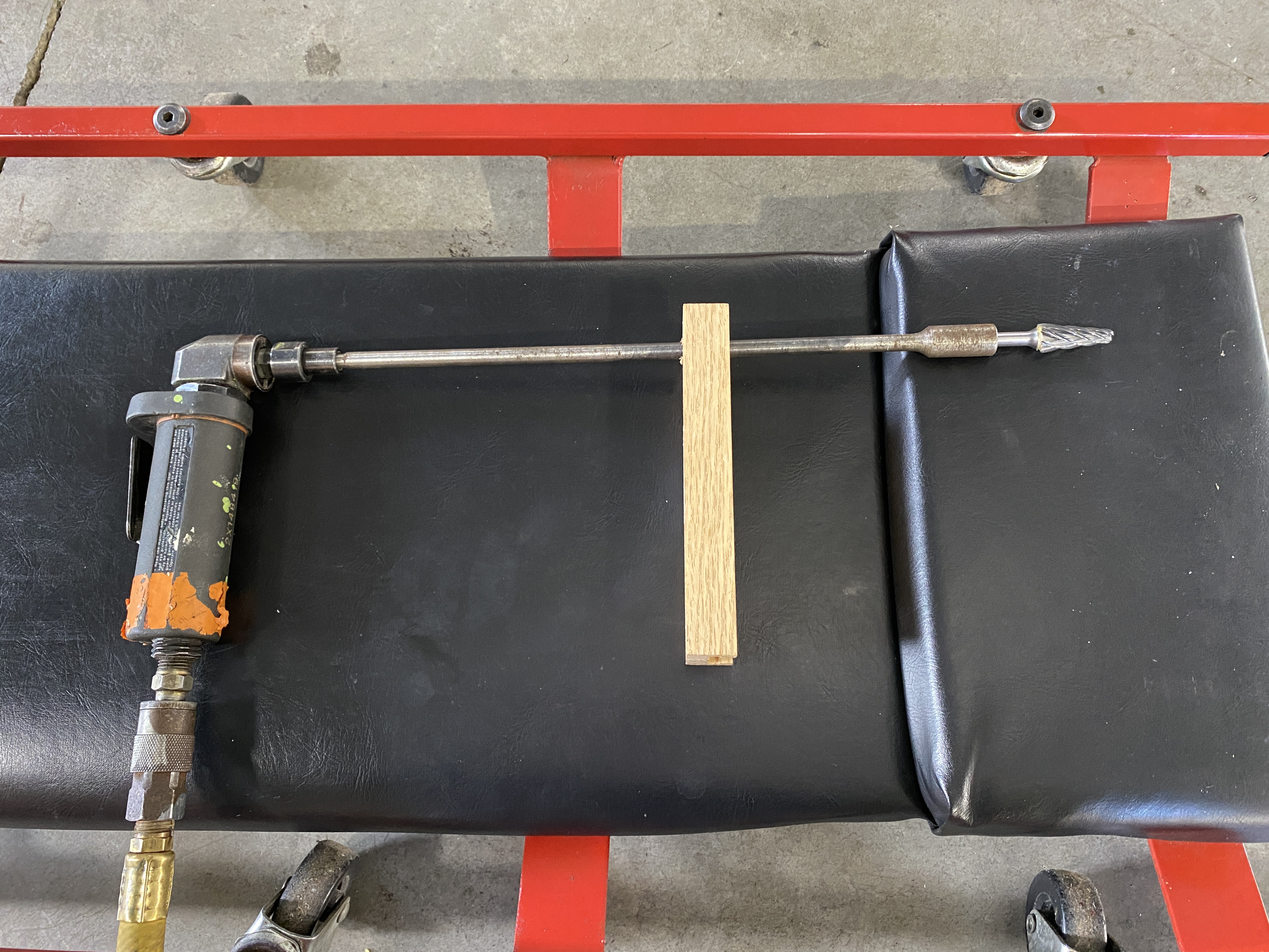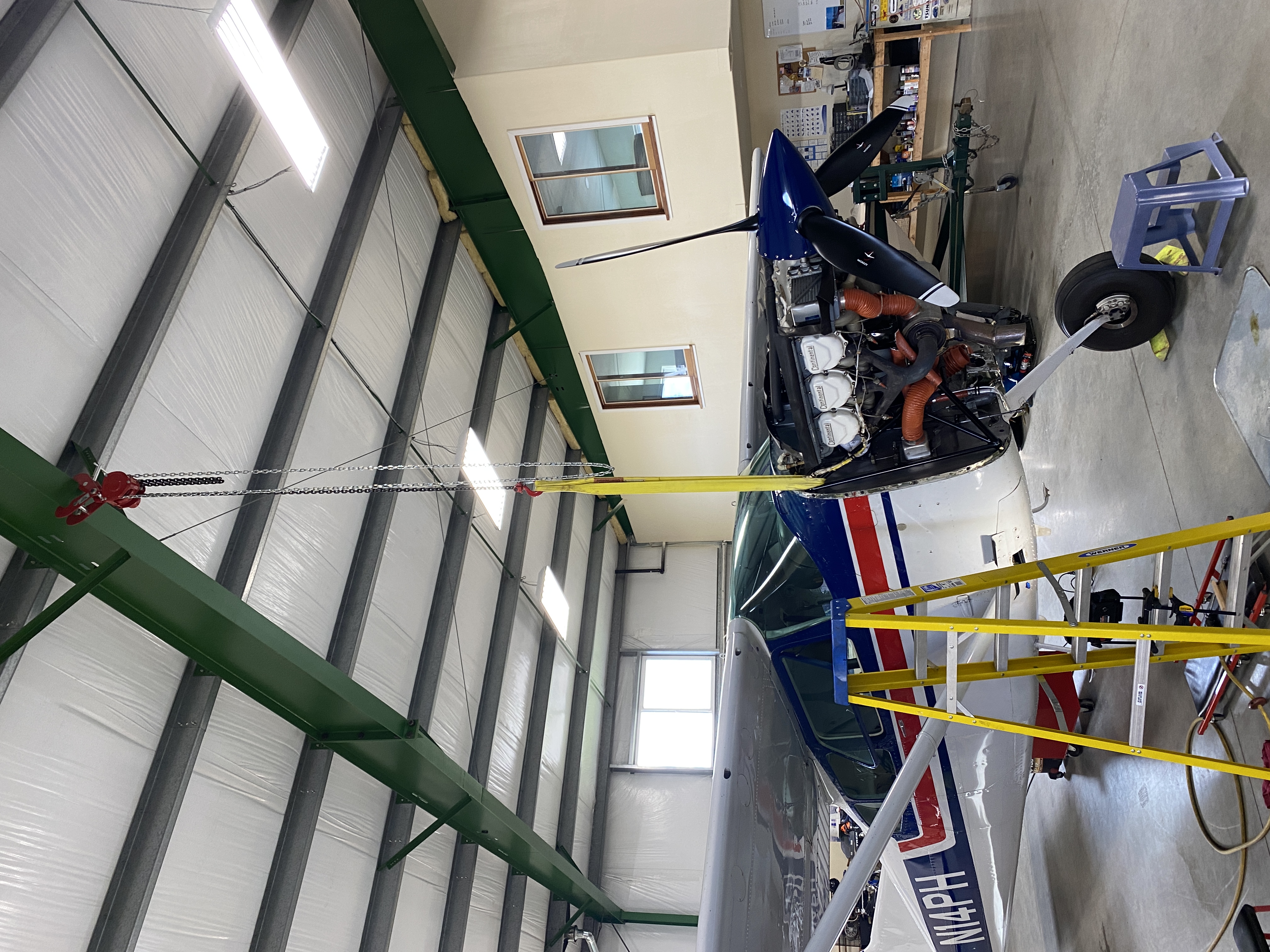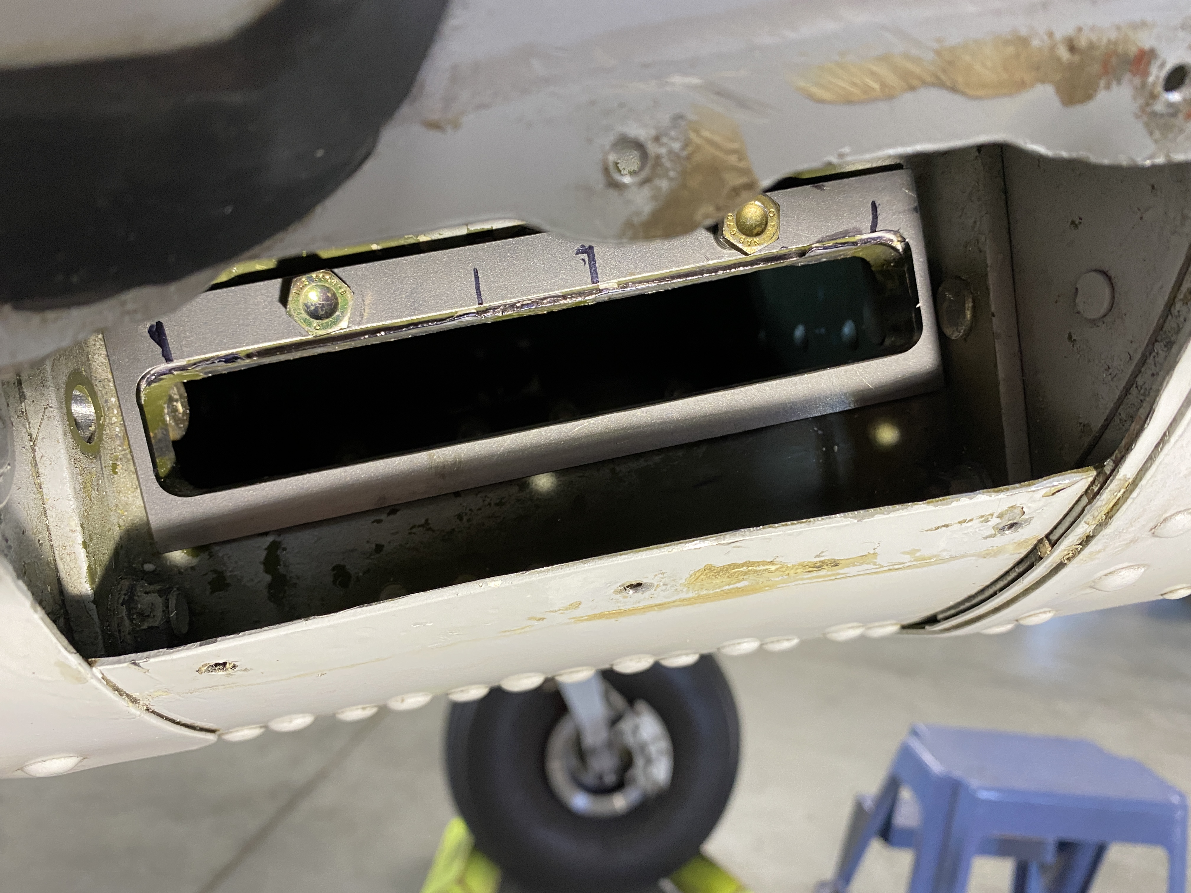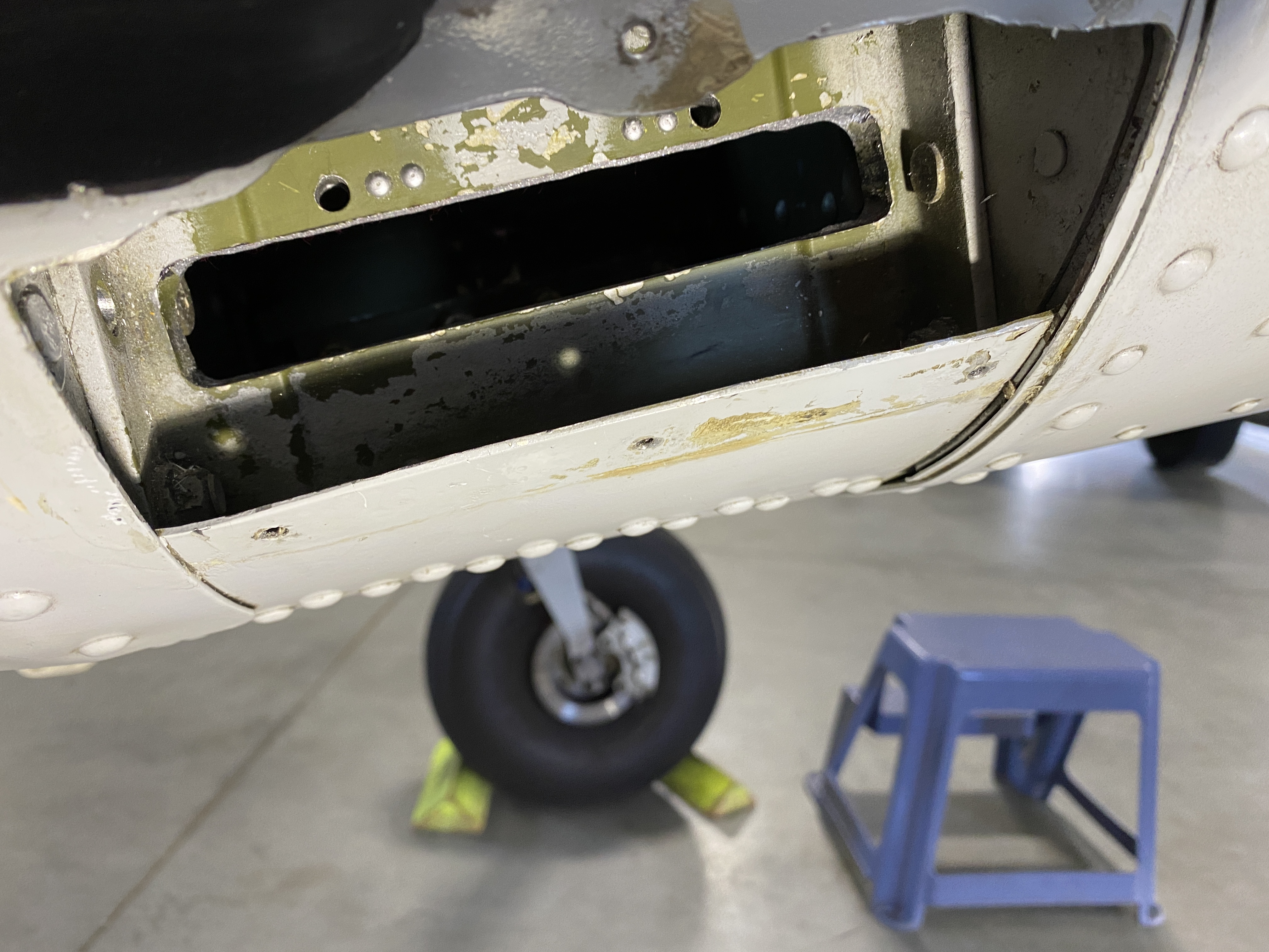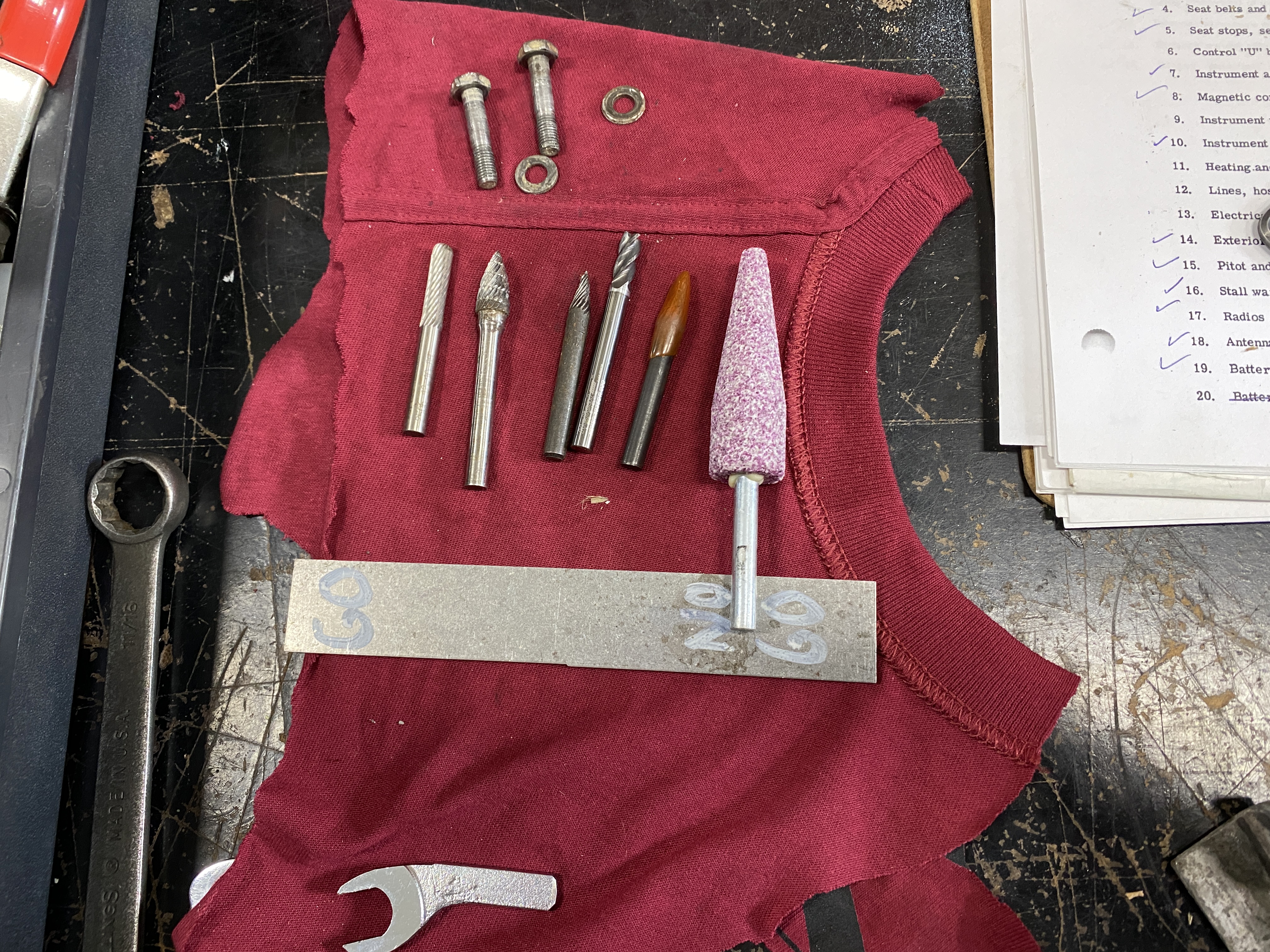 The pics are of the gearbox cutout with the STC template installed showing the material to be removed, the same area after rough grinding, the die grinder setup, collection of bits/stones available to me, the method used to suspend the airplane while doing this work, and the LH gear with wedges in place.