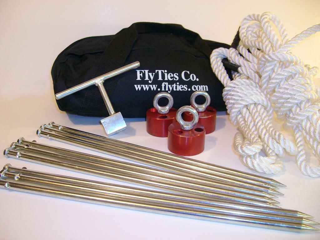 FlyTies® unique design allows quick insertion and quick removal using the easy-out extraction tool provided. Rugged, die-cast steel rods are 3/8" x 14" for deeper penetration into subsoil. Cumulative load capacity is 3,600 lbs. Kit includes 3 ea. aluminum hubs, 9 ea. steel rods, 3 ea. 3/8" x 10 ' ropes, easy-out removal tool, and rugged compact canvas tote bag. Complete kit weighs only 6 lbs. (less than 1 gal of Avgas) and has a lifetime warranty. Flyties Co. 408-966-4365 http://www.flyties/.com