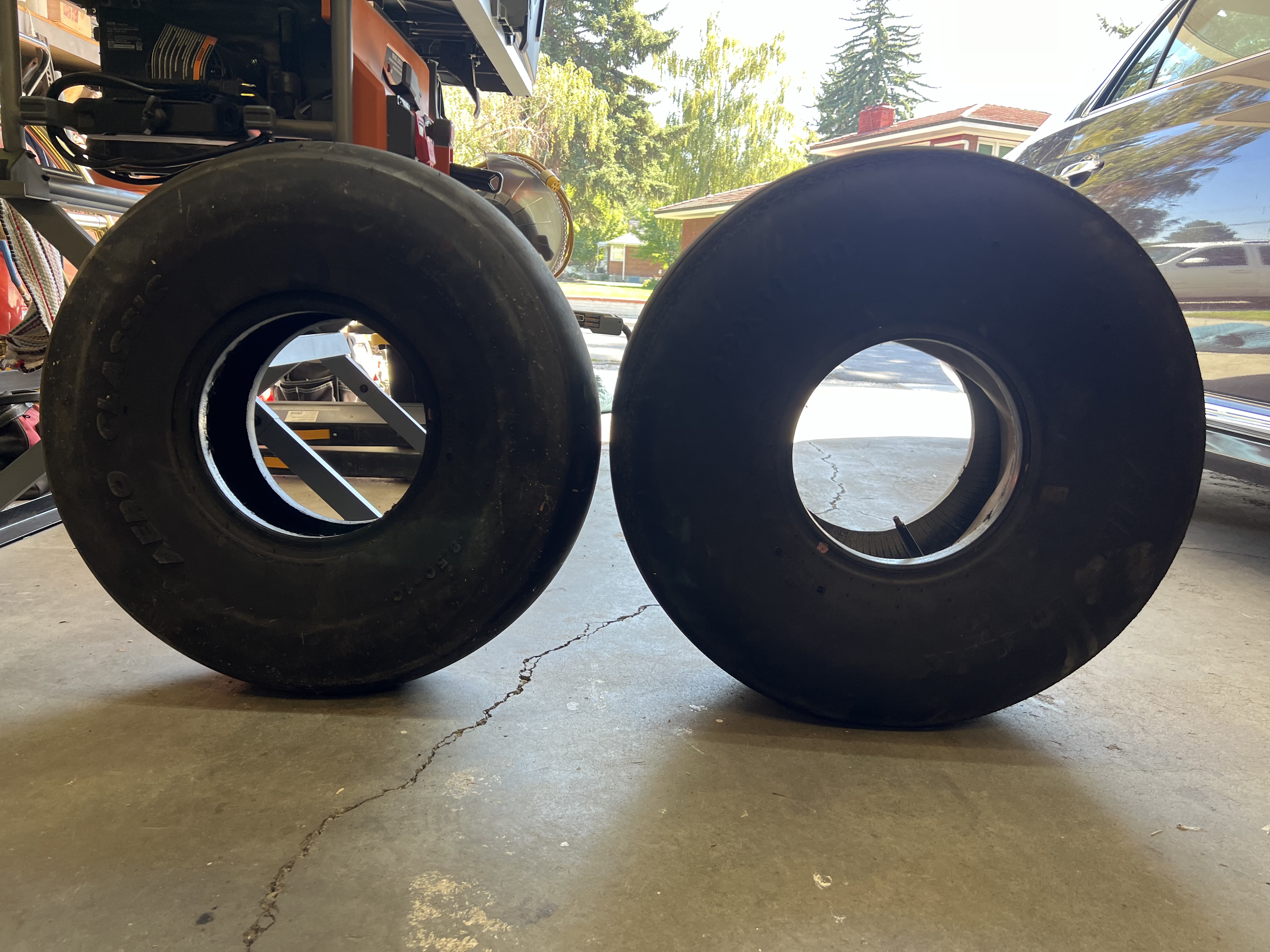 mtv wrote:My tires aren't the smooth Dessers, they are the standard 8.50 X 10 treaded tire. But, here is a comparison photo of that tire, mounted on the Airframes Alaska 10 X 10 wheel, next to an inflated and mounted Goodyear 8.50 X 6 tire. As you can see, there is a substantial difference in diameter and width.