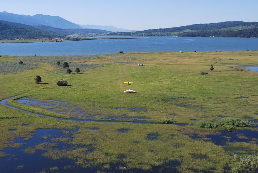 Just to the west a half mile or so of the airstrip, I spotted this hang glider tow operation(Dragonfly tug plane, piloted by a black women pilot, she had her act totally squared away, look at the length of that runway, and for a tow launch!) just getting ready to launch. I landed and BS'd with them after they got off. Someone on the radio was warning me of the runway shortness and roughness, I told them I would chance it