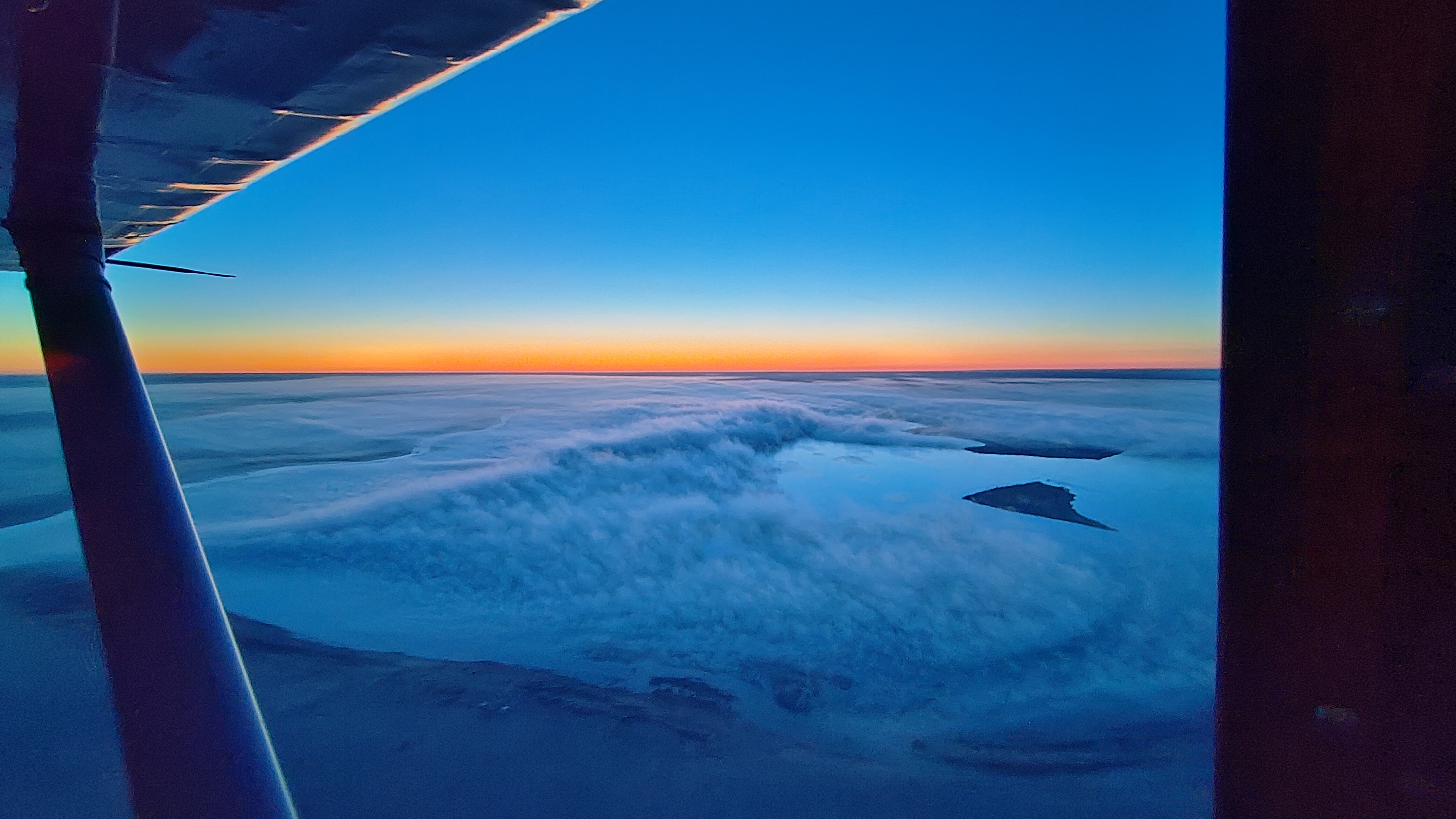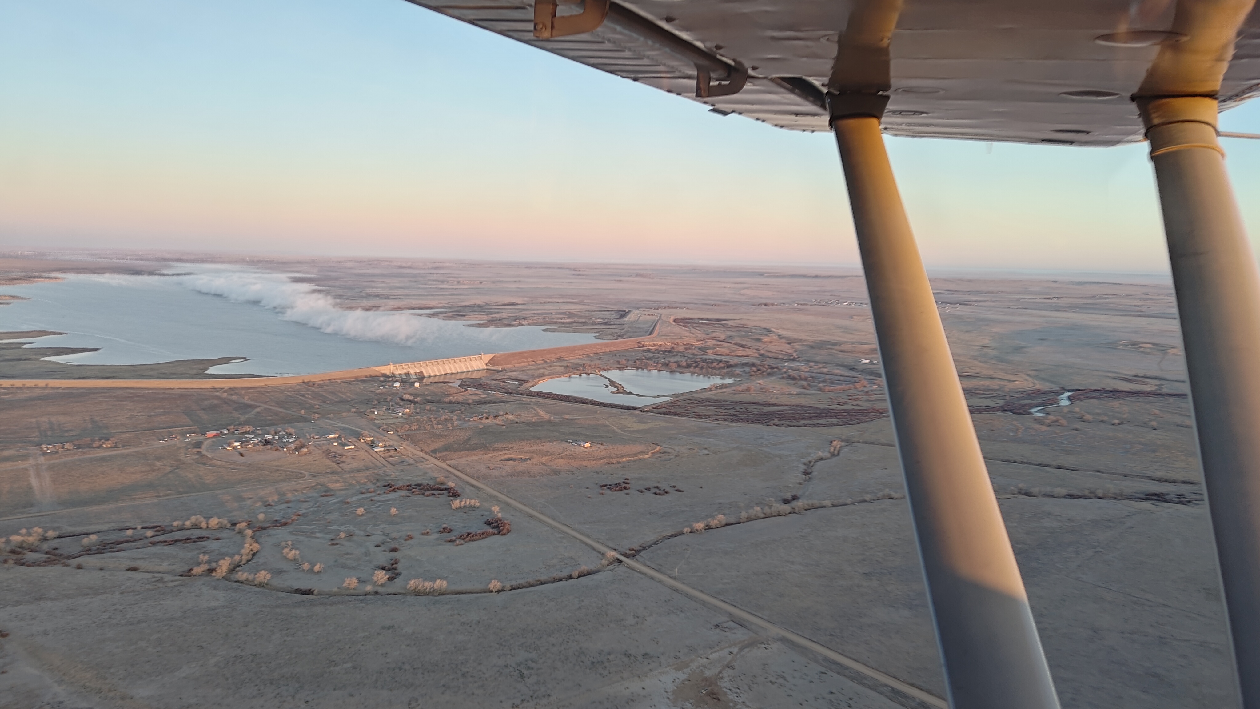 Now the Stinson owners here will know that the model 108 was designed to cruise at 108mph according to legend. I don’t usually see that exact number up at 6,000 feet but 100mph isn’t out of the question. So, with that in mind, it took a good long time to cross the vast, dark nothing that exists between the E-470 and the city of Las Animas, Colorado. I killed time by fiddling with my lights, taking bearings off VORs, and watching jet traffic zip away from Springs airport and into the void. The sky eventually got lighter as I approached Las Animas, but some quick math told me I was ahead of schedule. Lucky me, tailwinds. This would be the only leg I’d see them. I wasn’t keen on landing on that reportedly rough runway in the dark, lights or no runway lights, so I scouted out a nearby reservoir with pretty fog rolling of the edge until things got lighter.