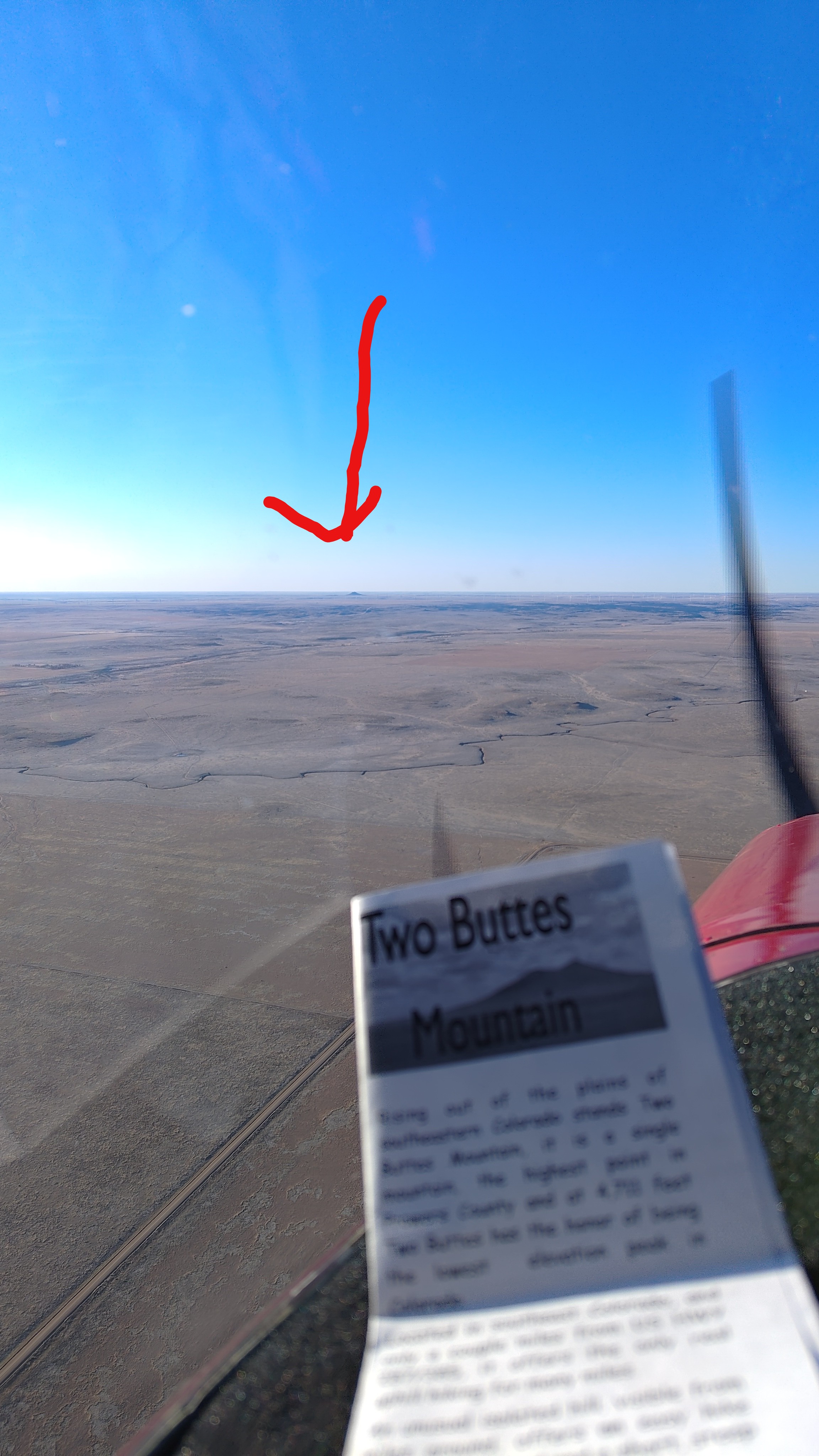 I had spotted a flyer during my visit to the Lamar FBO about Twin Buttes, a “mountain” to the south with “world class skiing, hiking, and bird watching.” So naturally I went searching on my chart and had no problem finding a dot that marked its location. Funny, I thought, the windmills next to it have a higher elevation marking than the mountain…? Sure enough, this little hill was the only natural object of any height for miles. It just also wasn’t all that tall. I circled just once before getting back on my way.
