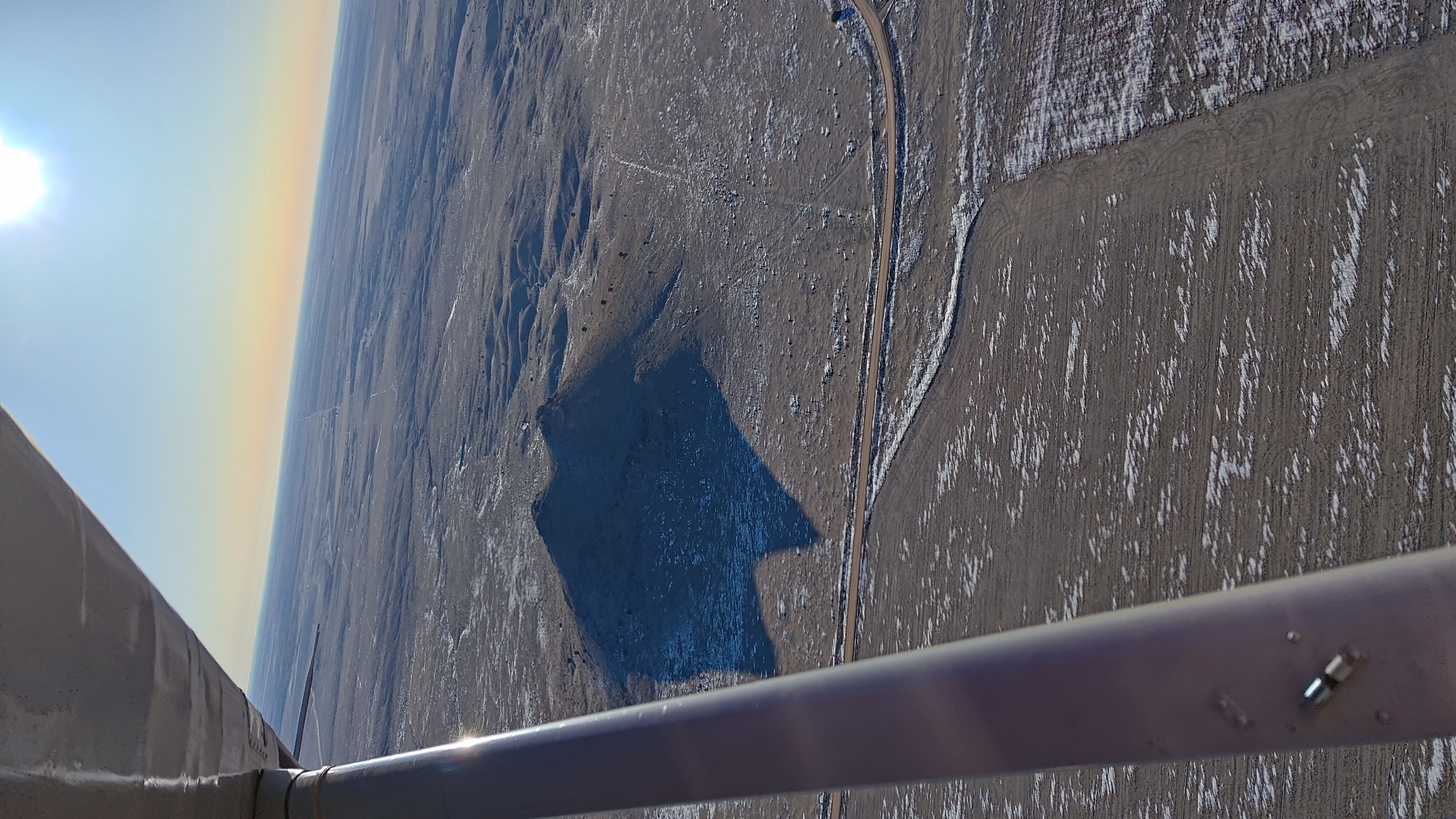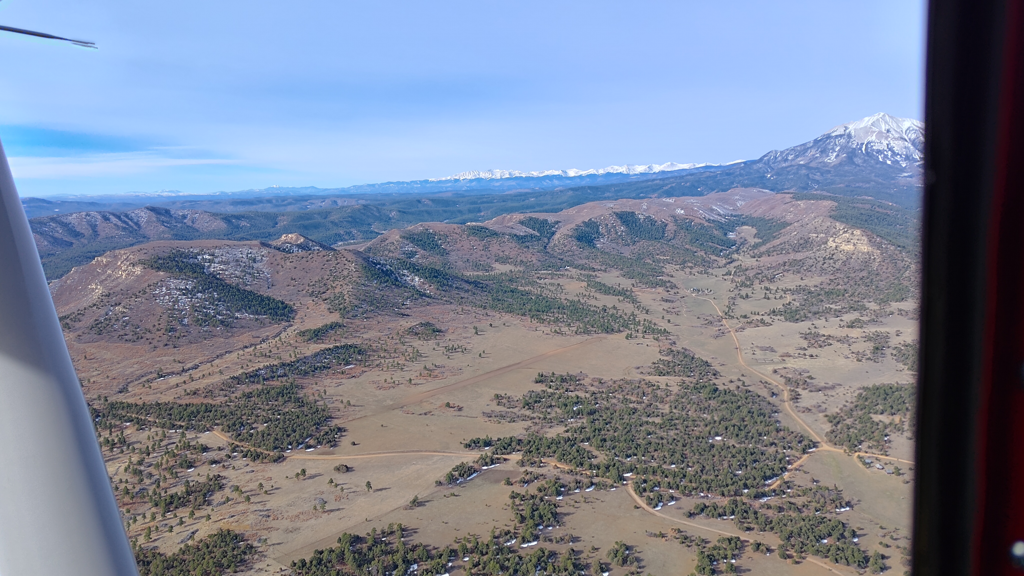 Some of the later forecast wind had started up by the time I hit Springfield, so I left them with a mediocre crosswind landing to remember me by and turned West. I had expected this to be one of the duller sections of the trip, since it would take me and my Stinson about an hour to cross over to Trinidad and the sectional looked pretty blank. Turns out I was quite wrong, and the land showed me gorgeous hills and valleys covered in windblown snow. These gave way to genuine cliffs and canyons. Plenty of ranches and farms to be had out this way, although the drive to town for market had to be an all day undertaking. One gorgeous private airstrip on the edge of a picturesque canyon caught my eye. I’ll forever be jealous of the places people find to carve out a runway. One direction held the snowy mesas south of Trinidad and Culebra Range, and the other held views over empty canyons and vast expanses to the horizon and beyond.