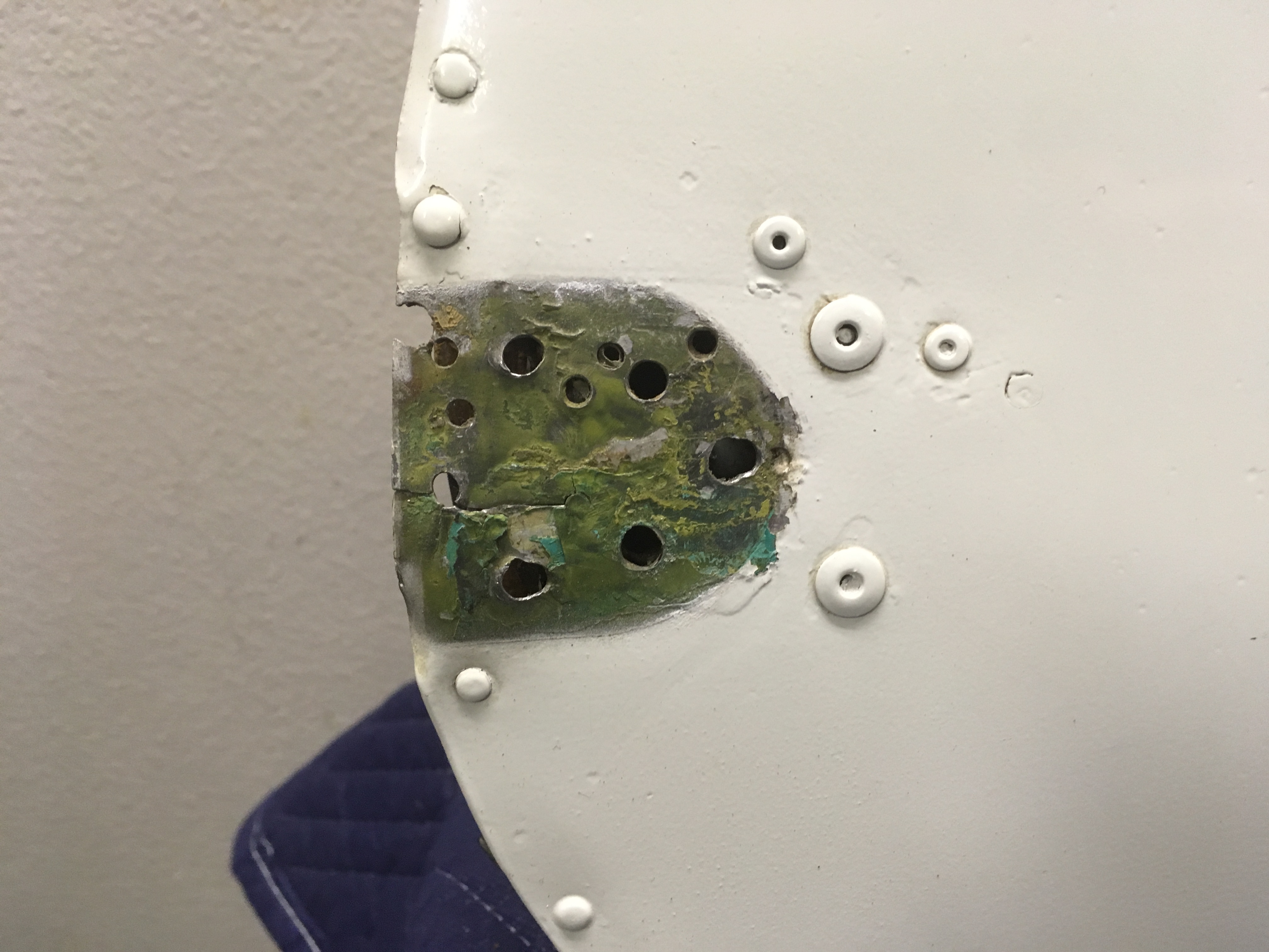 I need to re-attach a lower hinge that broke loose when the door slammed open in 20 knots of wind. There had obviously been multiple repairs over the years and now it’s time to fix it right. The pics show where the hinge was attached, the mess that the inside became over the years and the repair we did by cutting the old flange out of the inner door frame and making a doubler with a new flange. We also installed an extra piece of .025 between the outer skin and the new flange which runs aft for about 3 in.