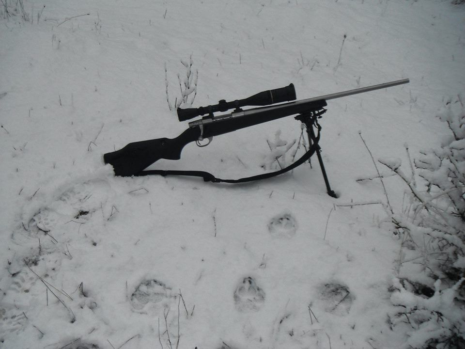 That is my Weatherby Vanguard 22-250 with a Leupold 6x18 scope, a real tack driver. The Jaunuary day with the snow I flushed one small black wolf out of the brush with my predator mouth call. It had the opposite affect and it took off the oposite direction. About 700 yards away. I did get on those other tracks of a big wolf and followed them for a couple miles. I lost the tracks where a herd of elk was earlier (track soup).