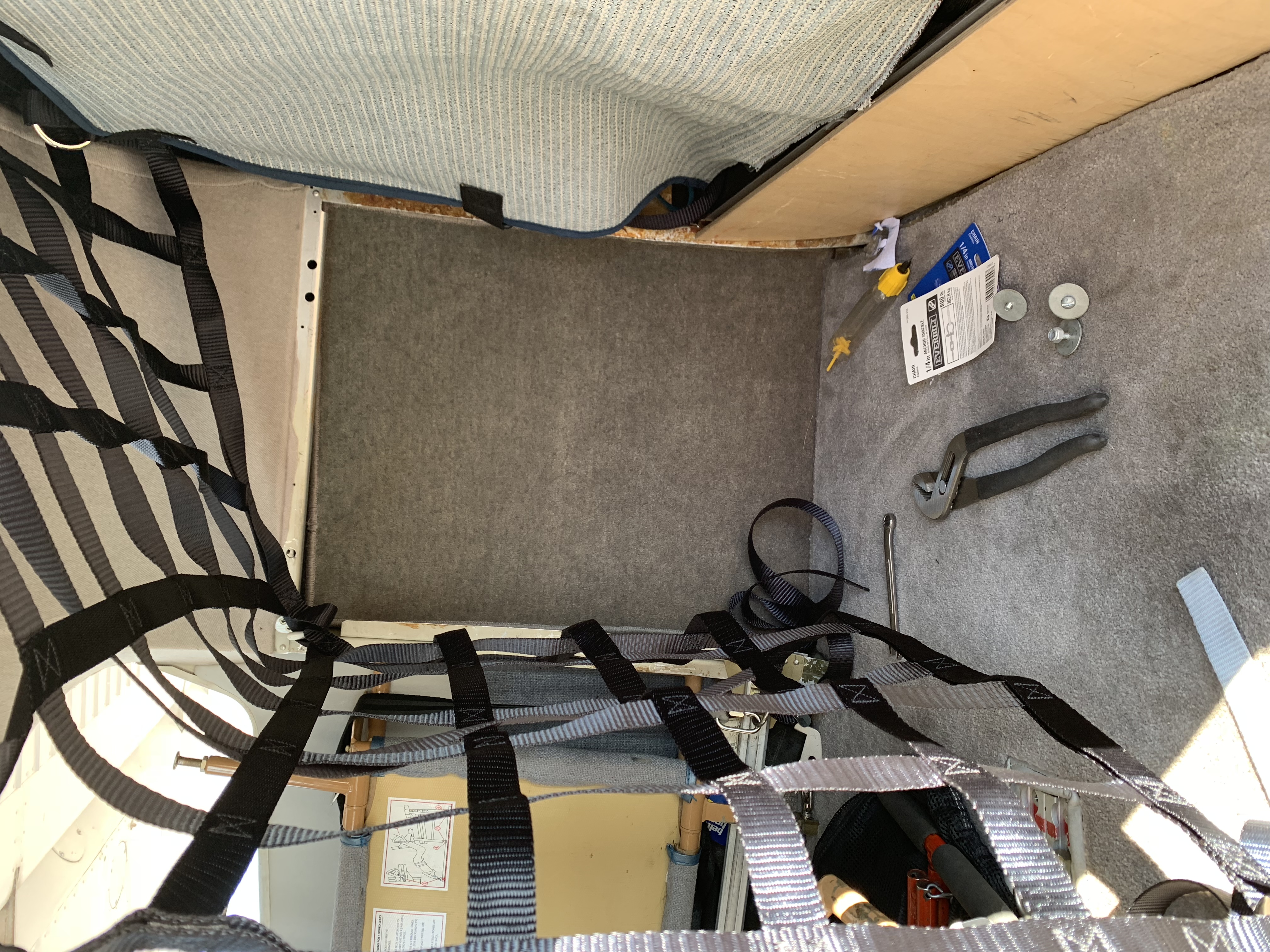 Its hillbilly enough that I know its better than what I had before. I sewed on 5 attach points, the front 3 all tie to the Atlee seat rails, and the back 2 to two hard points in the floor and bulkhead. The goal is to limit projectiles, and I'll still use the webbing over a bicycle.
