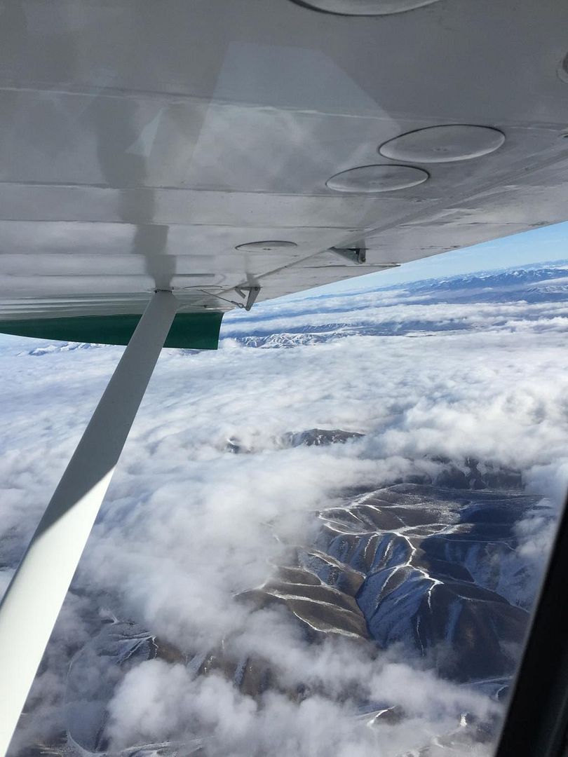 Like I had planned/hoped, the cabin I was landing at was clear of the fog, but just by 1/4 mile at best, totally in clear though. The batteries checked, it was time to go before that fog moved closer. I landed it wrong, parked wrong anyway, so that by the time I got parked on the side slope it would be problematic as to whether I could get turned downhill for takeoff before sloughing off the side slope. I pulled it back a few feet, but not enough, (the skis don't like going backwards too much) so I then carefully worked the plane more downhill (careful not to just wrench the tail around like in the summer, that's real hard on the gear when on skis, I've heard the stories of guys twisting the gear off)