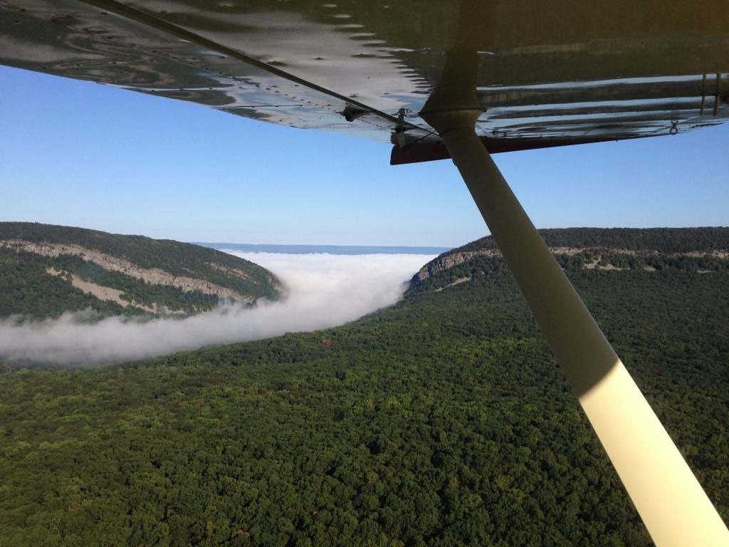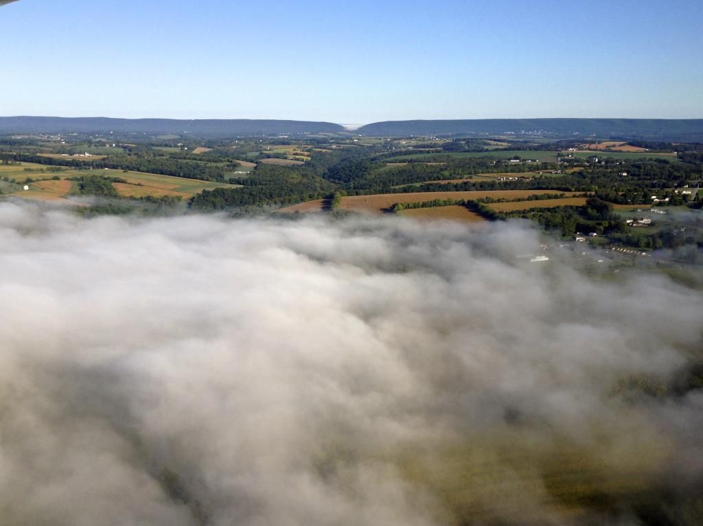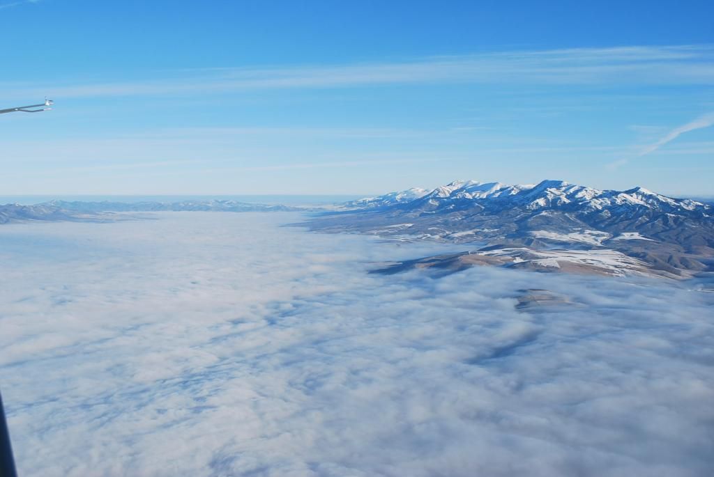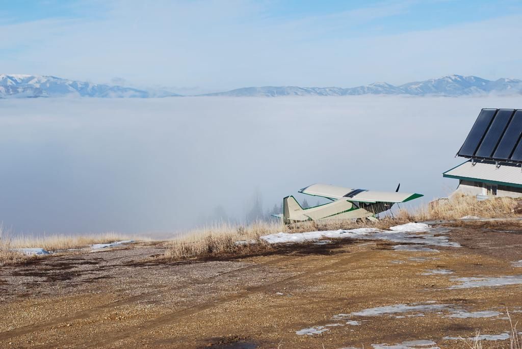 The fog layer was lapping at the end of my 400' runway, but by the time I finished getting coffeeed up it had receded to the windsock at the bottom of my property. This left me just enough room to get off and hang a sharp left, and then fly in the clear and parallel to the fog bank, at all times having a clear option in case of power failure. While doing so I climbed and was well over 8K before heading out over the stuff, high enough to make a emergency landing on either clear sides of the valley. Looking back at my place while heading out over the fog.