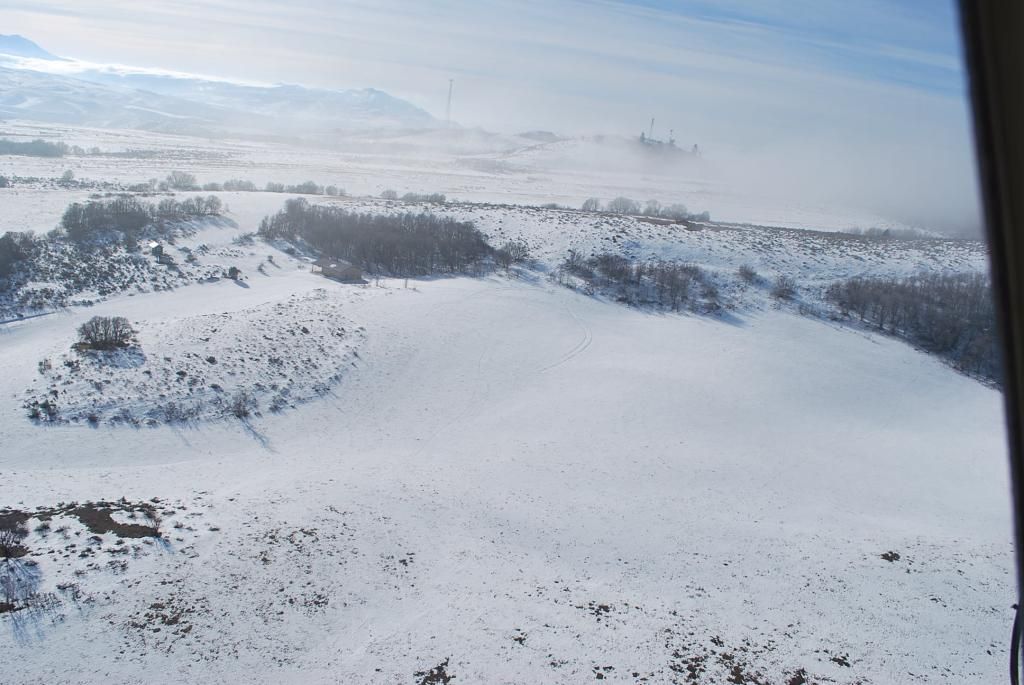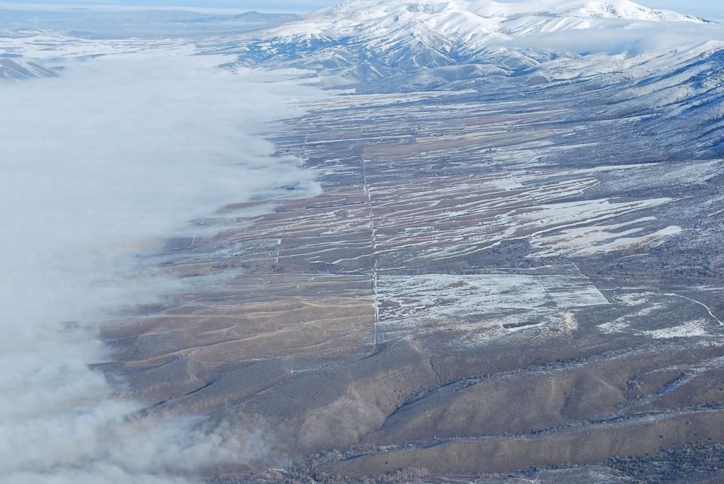 Coming back, again at altitude after recrossing the fog, my place is just to the left of the center dirt road.