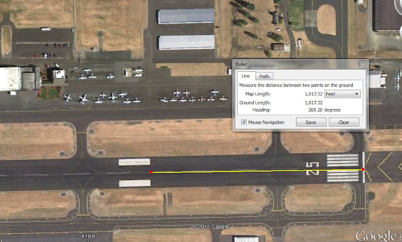 Good News, I think! Using the Google Earth?ruler technique, I have found that with starting under the power wires on the SE end, I measure 1310 feet to the 50 foot power line on the NW end of the runway. I haven't had the opportunity to check the accuracy claims for this routine, but I feel they must be good enough to say this strip looks possible now. A little more dozer-scaping will be required but I think that cost will be reasonable enough to have my A/C accessible within 200 feet of my house rear door. I have a lead on a nice looking Aeronca 11 AC and will be pursuing that for a while. Will be back to report on the development later on.