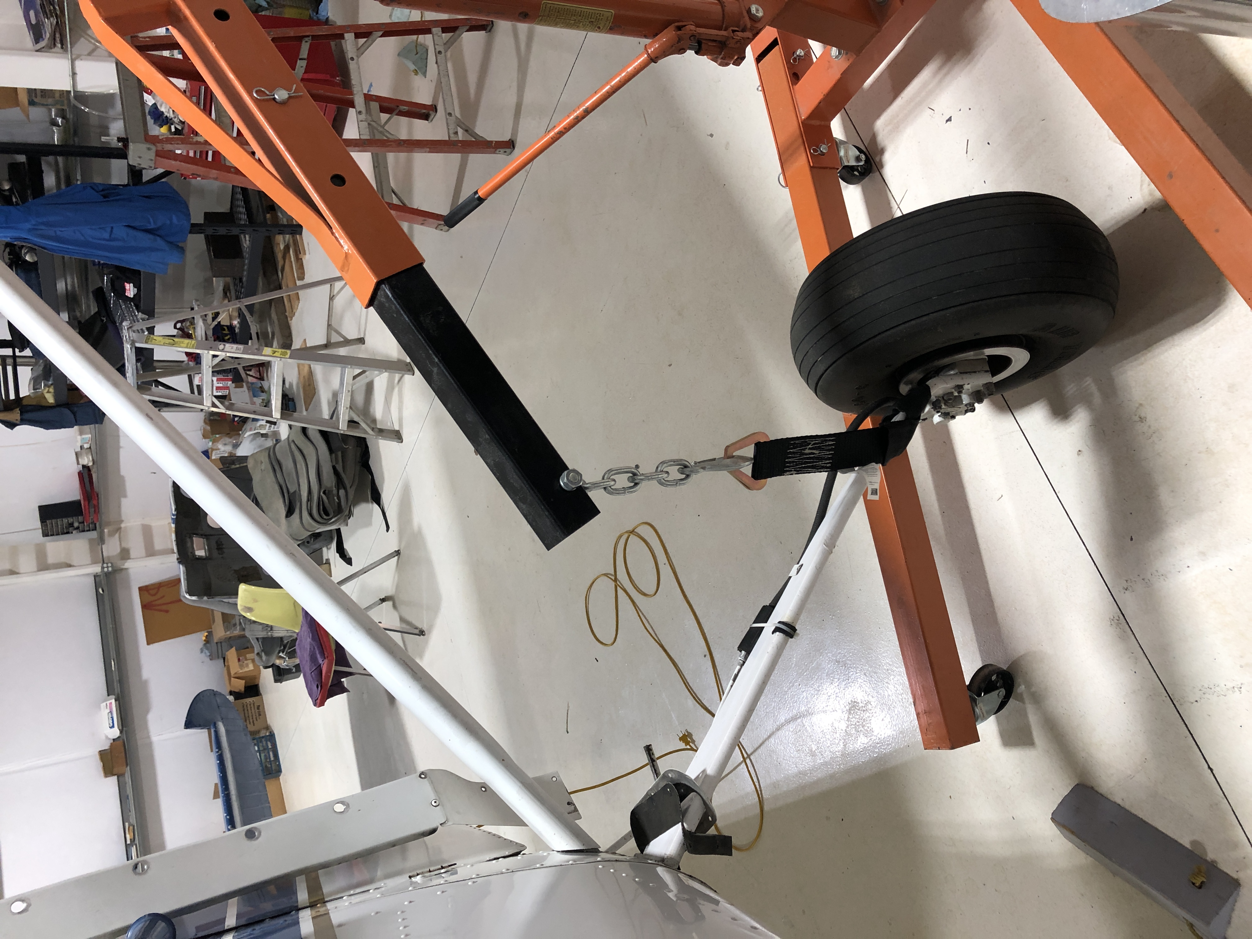 I do a combination of what Bart is doing with the strap around the engine mount at the firewall using an engine hoist. Also I use a jack that is used for a retract test with a padded block of wood under the gearbox. I jack both in stages. Also, with the 29 inch Bushwheels I roll the tailwheel up on a stack of pallets to level the plane some. Another thing I do is put a 2x4 between the base of the jack and the bolts that hold the axle to the spring landing gear and that keeps the gear from flexing in when it comes off the floor.