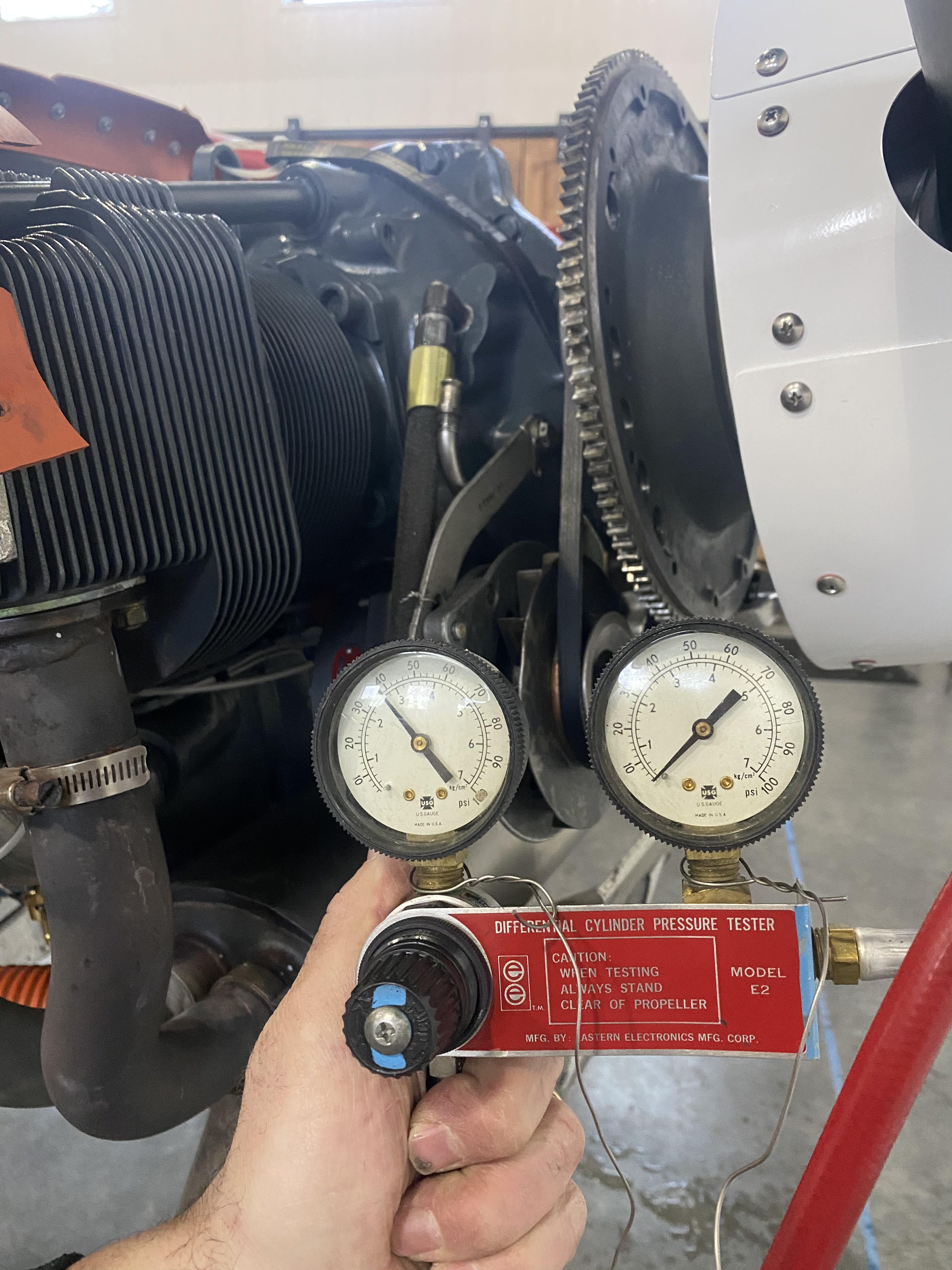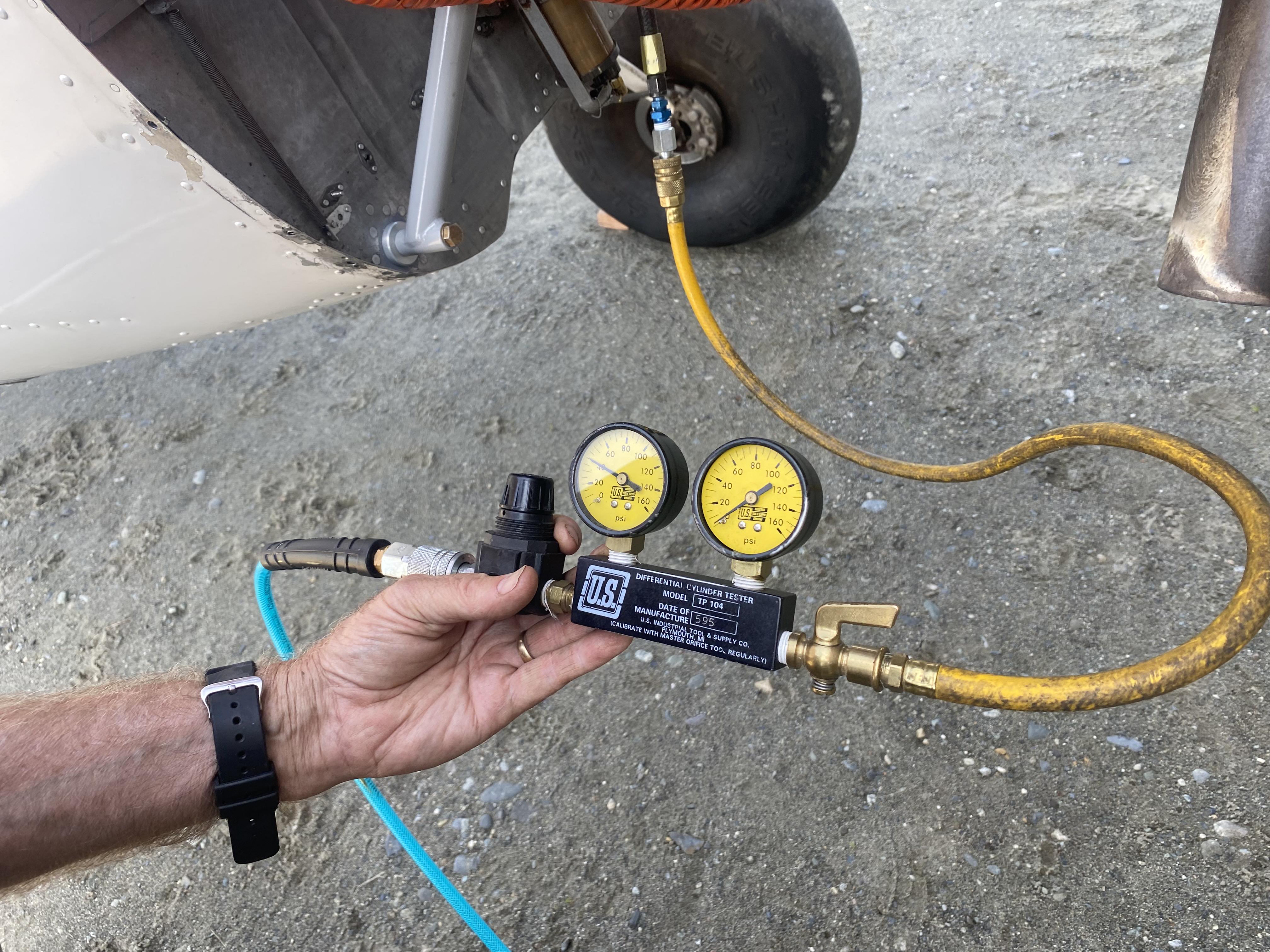 We then followed Lycoming service instruction NO. 1462 (Propeller Oil Control Leak Test Procedure) which essential entails building a test plate to go over the governor mount and testing the pressure over the main bearing. Under pressure the tolerance should be between 6-35 psi for an acceptable tolerance reading. We tested every which way and get zero. Complete blow by.