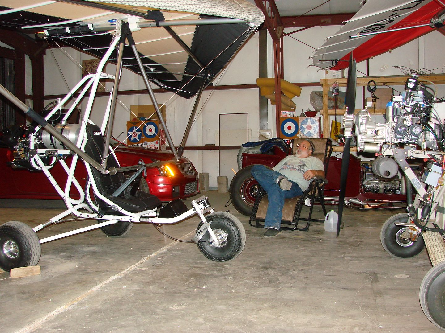 175 magnum wrote:That hanger picture pretty well says it all. Layed back with fat tired trike in front, hot rod in the back and a half empty jug of moonshine on the floor close to the chair. Looks like life is good down your way.