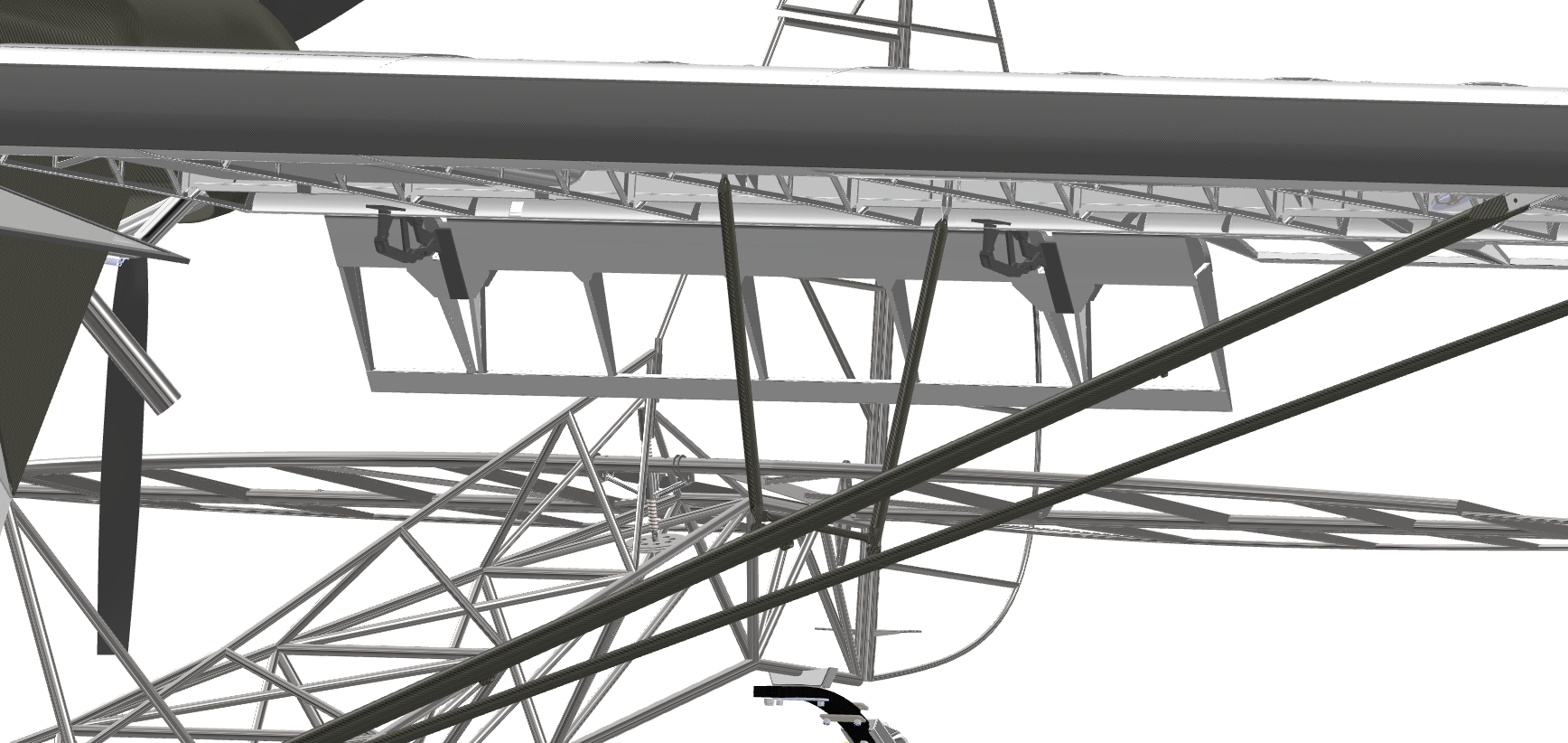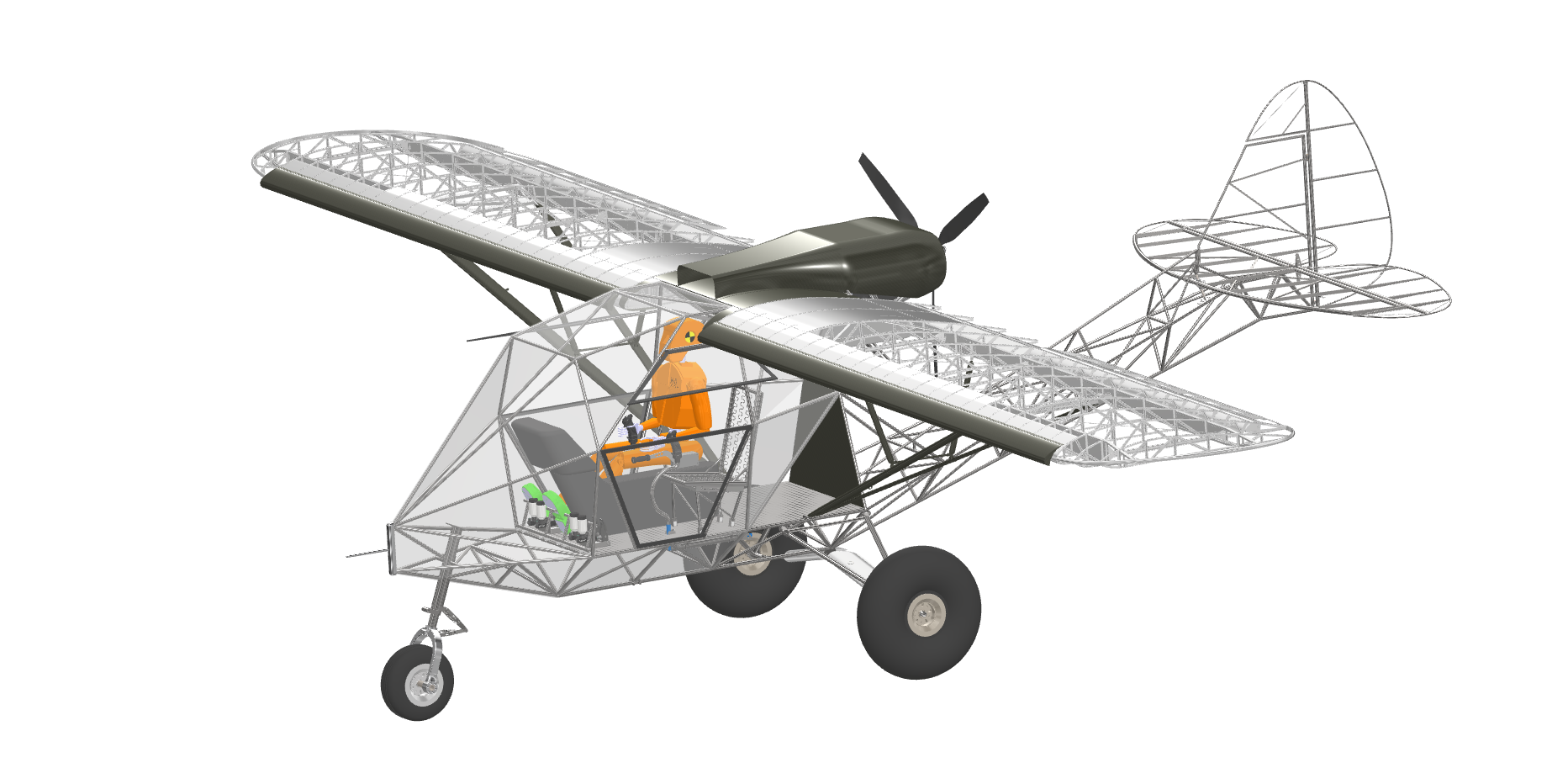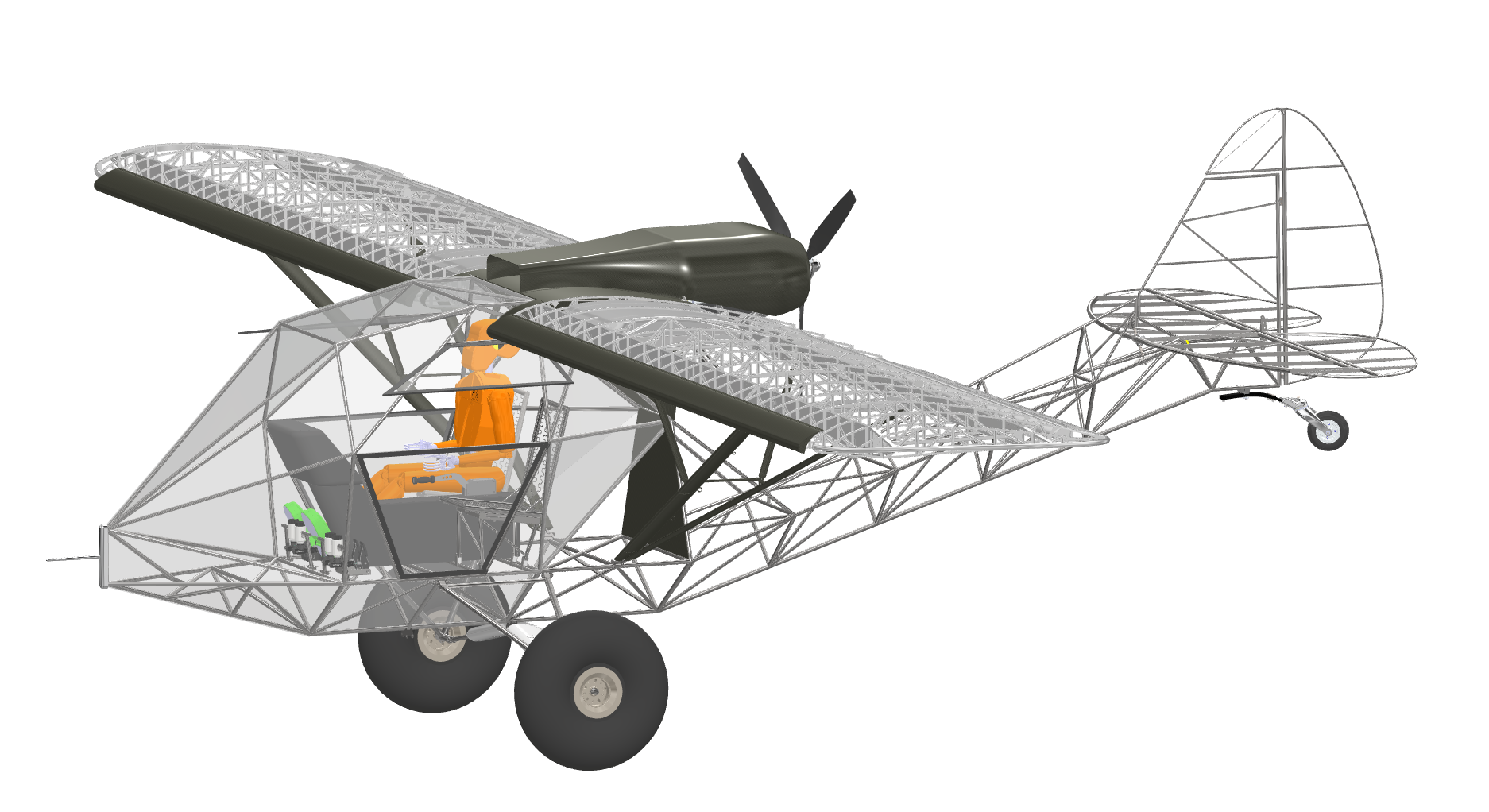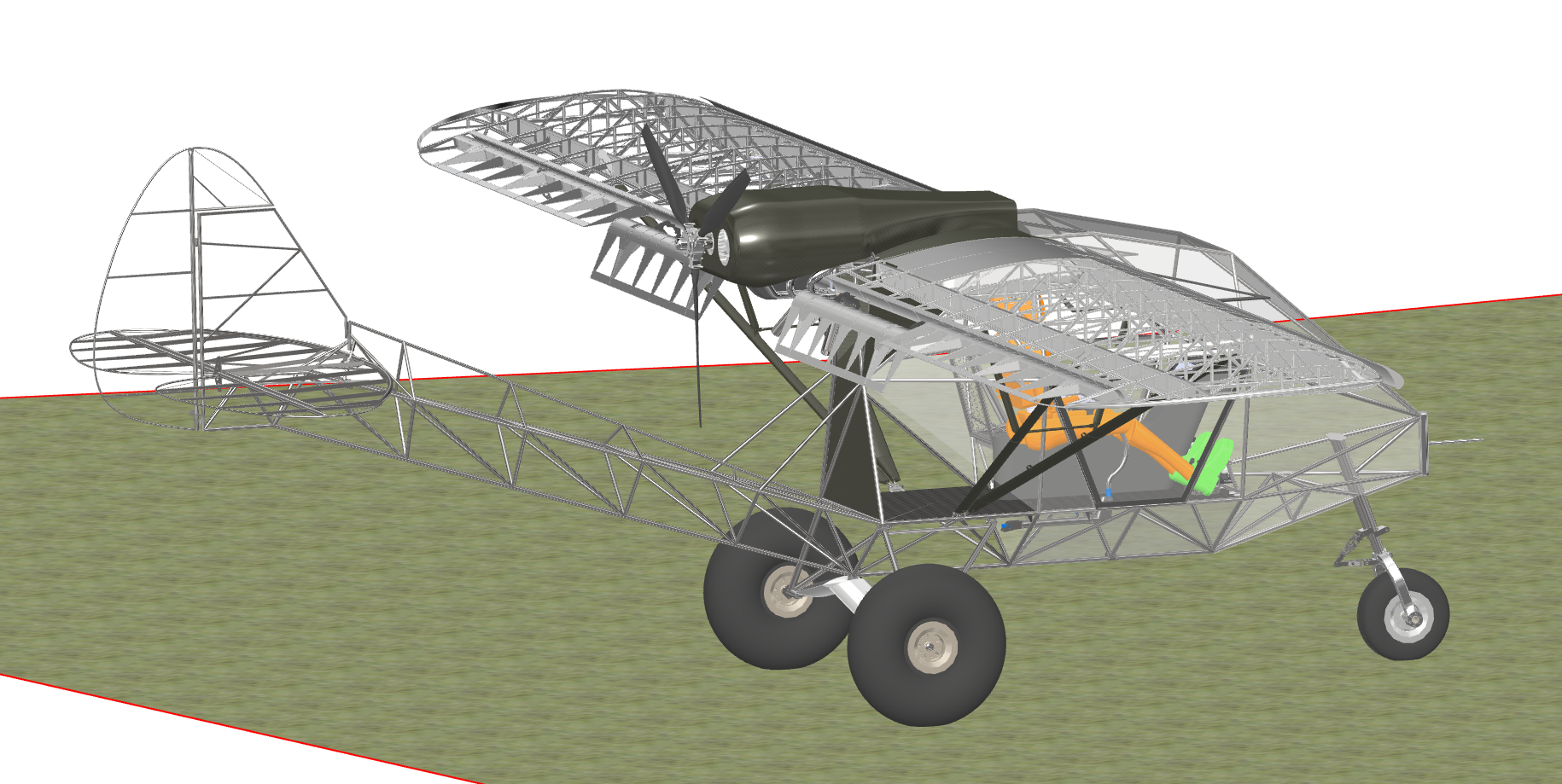 You may note the air frame itself is based on a tried and true Breezy design with a few basic mods for side by side flying and pusher configuration. Many thanks to Don VanRaay at VR3 who supplied the drawings for the air frame. The current engine mount is for a UL 520 swinging a 72 Warp 3 blade. This was all designed to minimize tubing bending and use flat sheets of plexiglass for ease of installation on the cabin. CGs looks good by the models. Both tri-gear and tail dragger configurations are available with only minor changes. Incidentally if the brackets were installed you could likely change the configuration at needed.