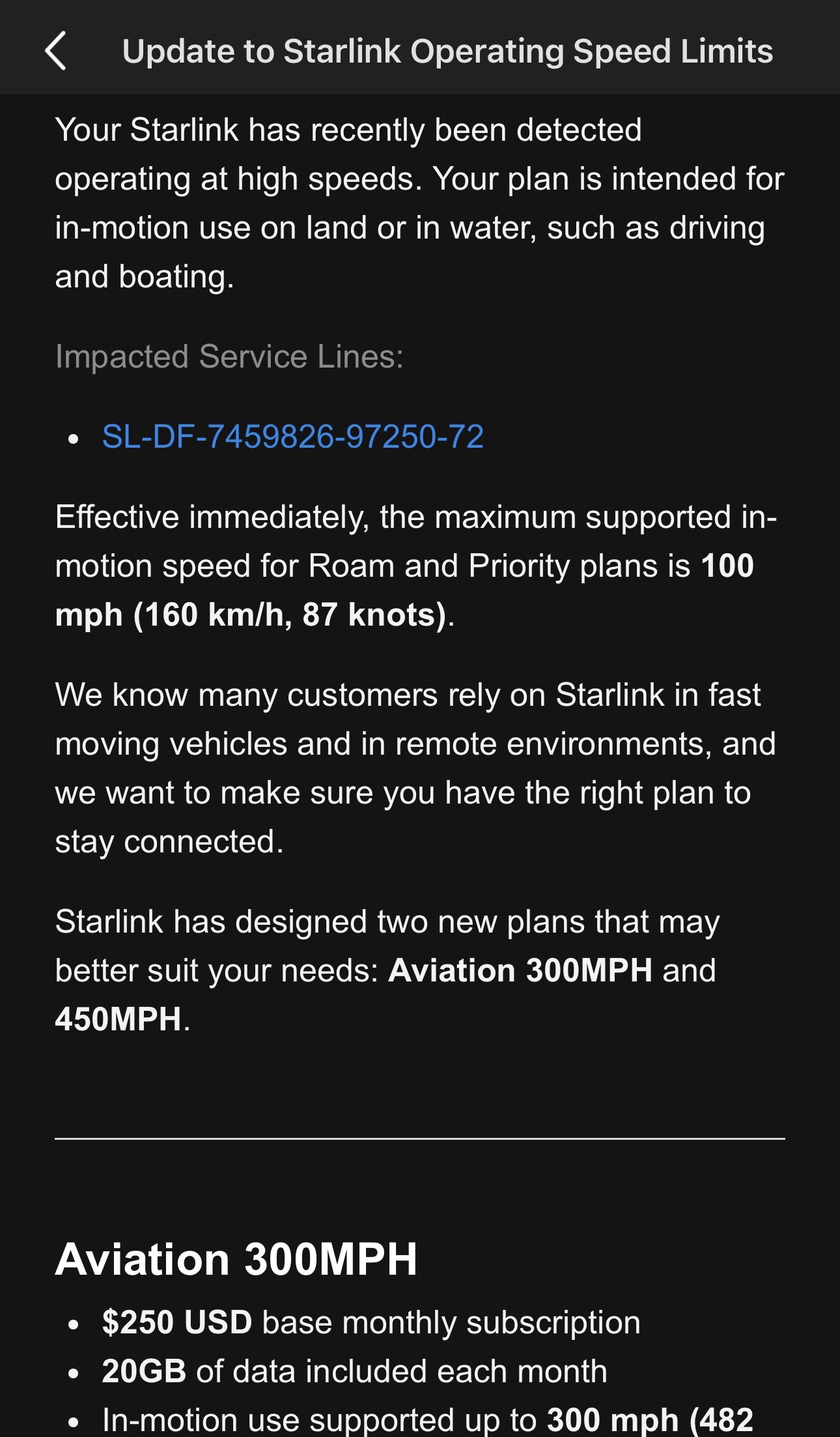 Oh that's going to suck. Especially if they rigorously stick to those numbers. My Husky is about 100 KTAS so it will get prohibitively expensive. I've been very pleased with the 'standby' rate of $5/month ($7 CDN) and 500 kbit throughput. It's enough bandwidth for Foreflight weather and voice calls, but nice to know full speed was available on demand if needed. Oh well. Elon does what Elon does I suppose.