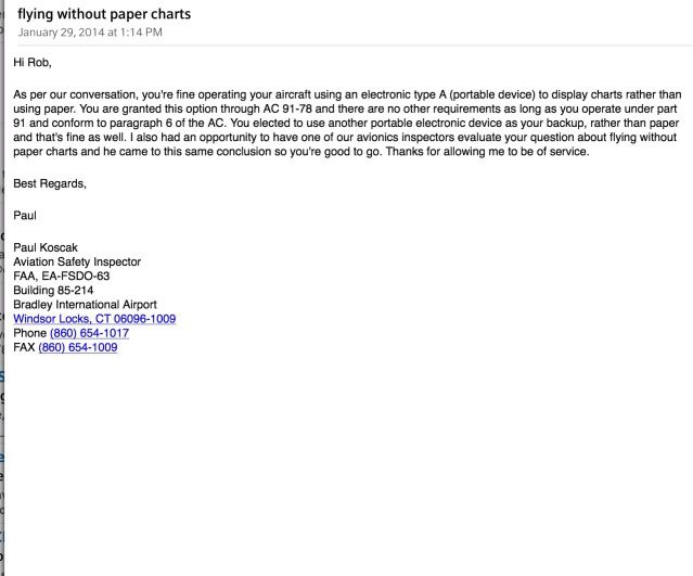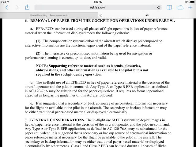 As I fly the Maule in IFR quite often, it is nice to know that a reasonably priced program like ForeFlight is a 100% legal replacement for paper charts and approach plates, and that the very expensive (~$1000/yr) Jeppesen or Garmin subscriptions are not required.