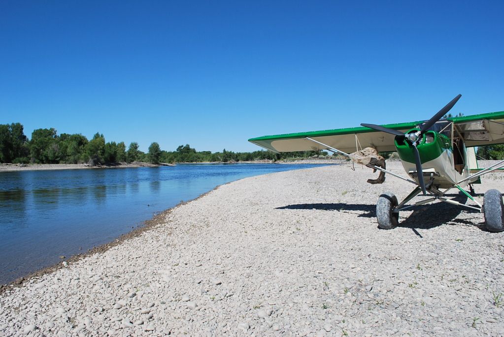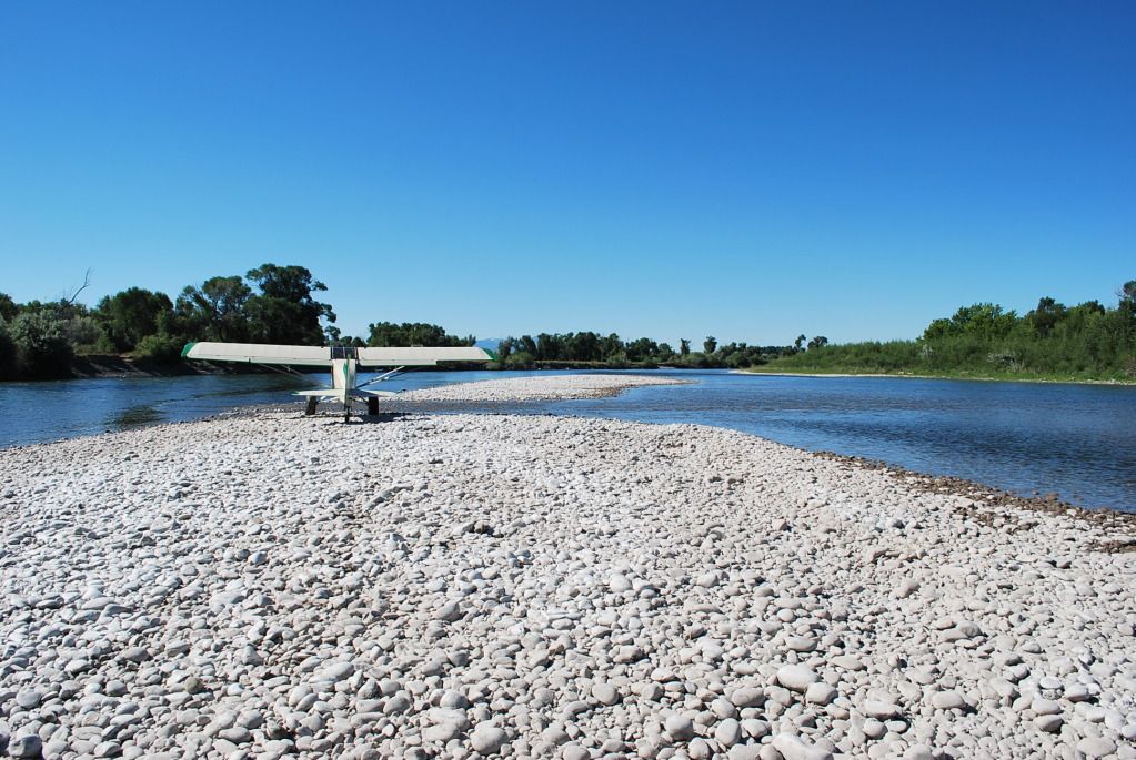 I had another solar panel delivery to make, to a town about 75 miles away. When I offered to deliver it for no charge, I expected the usual disbelief and suspicion (what's the catch?), that's when I tell them they need to meet me at the airport or have a place to land on their property..... it turns out this customer flies a Long EZ, so I met him at his hangar, pretty handy for him and for me.Image Business concluded, it was now time to play a little on the gravel bars, this was a fun one. What's keeps them interesting is they change every day it seems, at least every week they for sure do as the water level fluctuates or debris appears or disappears.Image I decided I needed this chunk of driftwood for my landscaping around the shop, not as heavy as it looks as it was pretty dry, draggy though. Much over 80 mph flying home I needed a fair bit of left rudder.Image It looks better here then in the way on the narrow bar I retrieved it from. 8) Image