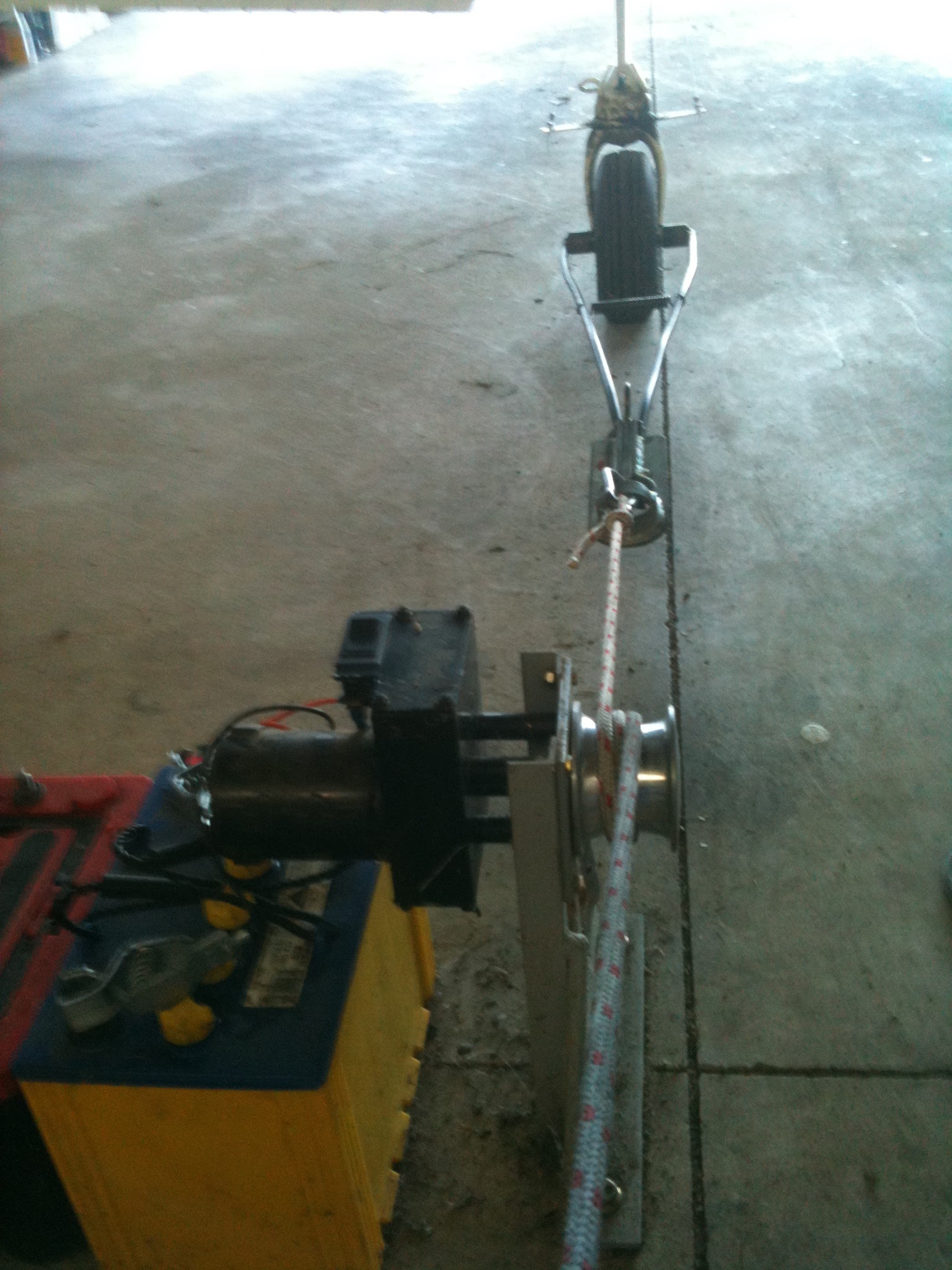 Well, I finally got around to getting a solution to this problem. Figured I had better do it while it's nice outside and not leave it until there is ice on the ground! Besides, my friend had been holding on to his father-in-law's impact drill for about 8 months now waiting for me to be ready to do this! So, last week we met at the hanger and punched two small holes through the concrete floor, slightly angled to help them anchor in. The final design was the Harbor Freight winch mentioned above with the remote and one of their mounting plates. We used two 6" bolts to mount the plate. Those bolts also are the bolts that slide down into the holes to anchor it to the floor. It is designed to be removable when not in use. Just slide it in and out. The front bolt to secure the plate was shorter and I put a chunk of wood on it as a spacer (due to the slight angle that the long bolts went in on). This makes it sit solidly flat on the floor.